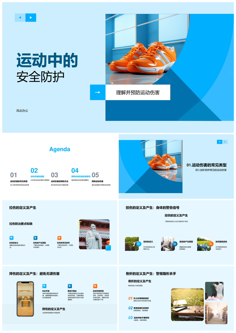 风云办公提供的运动安全防护防拉伤扭伤摔伤PPT模板,下载格式为pptx,一共33页,作品中文字及图均可以修改和编辑,图片更改请在作品中右键图片并更换,文字修改请直接点击文字进行修改。