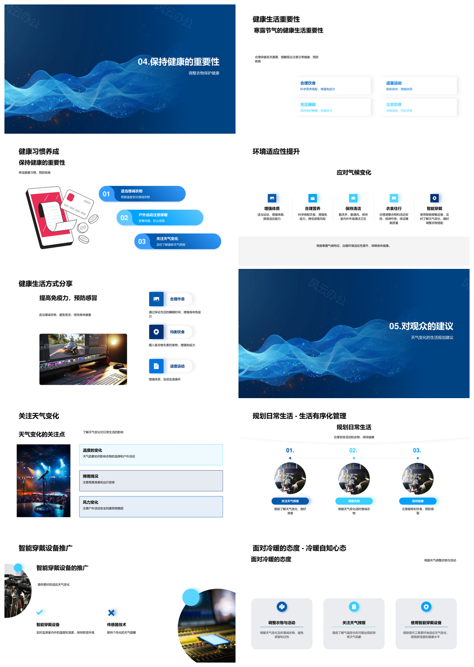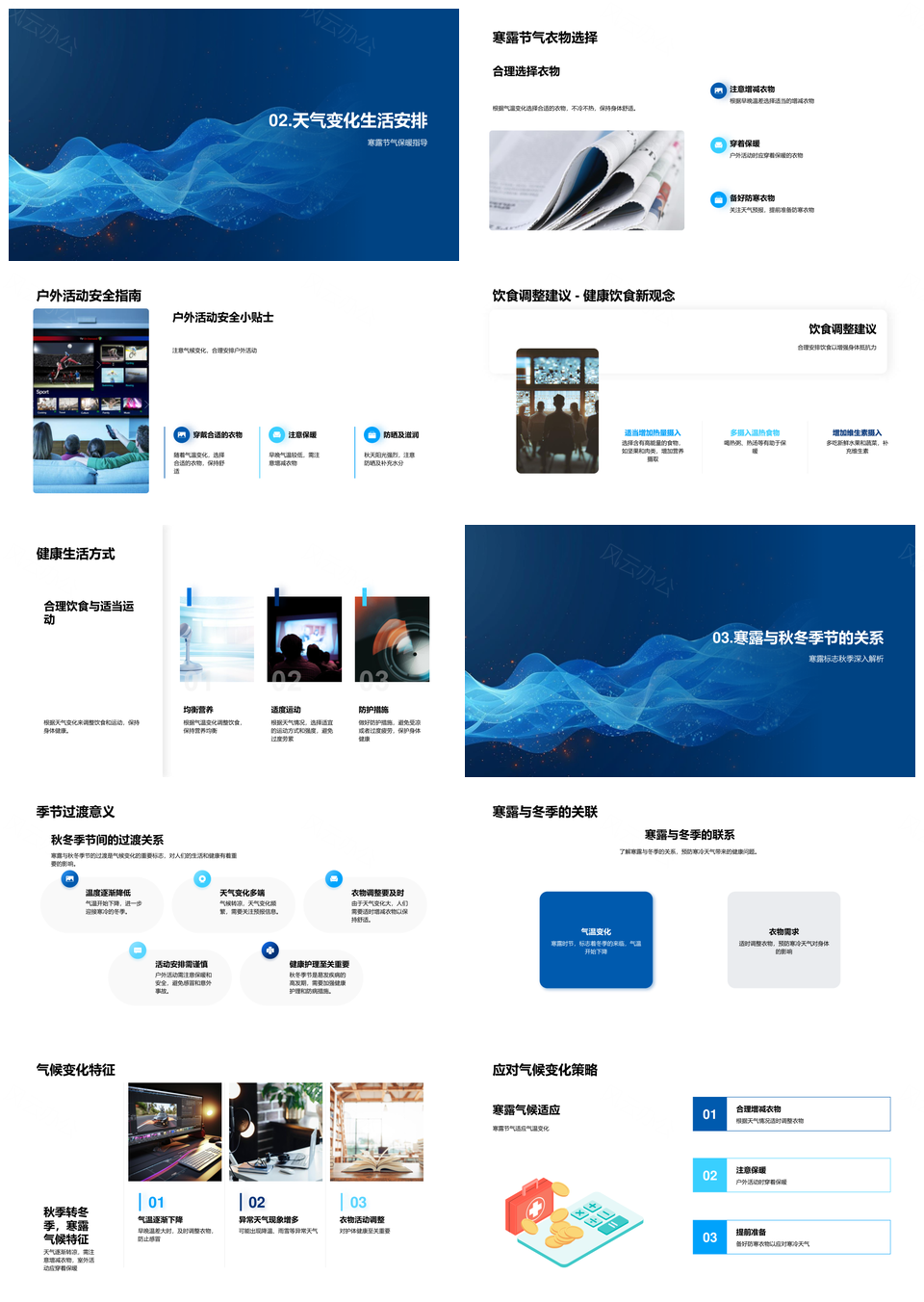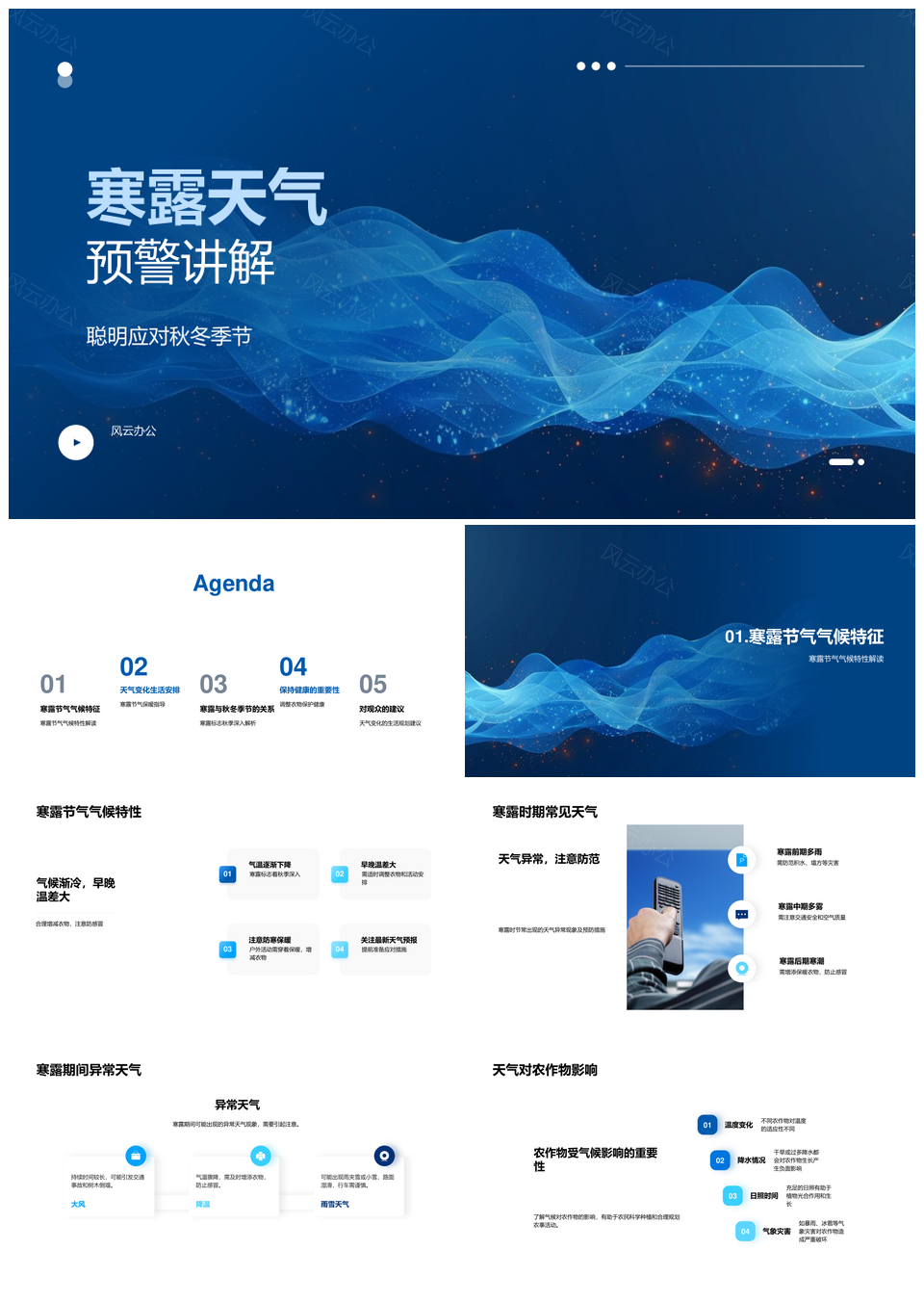 风云办公提供的寒露秋冬天气预警保暖增减衣物PPT模板,下载格式为pptx,一共28页,作品中文字及图均可以修改和编辑,图片更改请在作品中右键图片并更换,文字修改请直接点击文字进行修改。