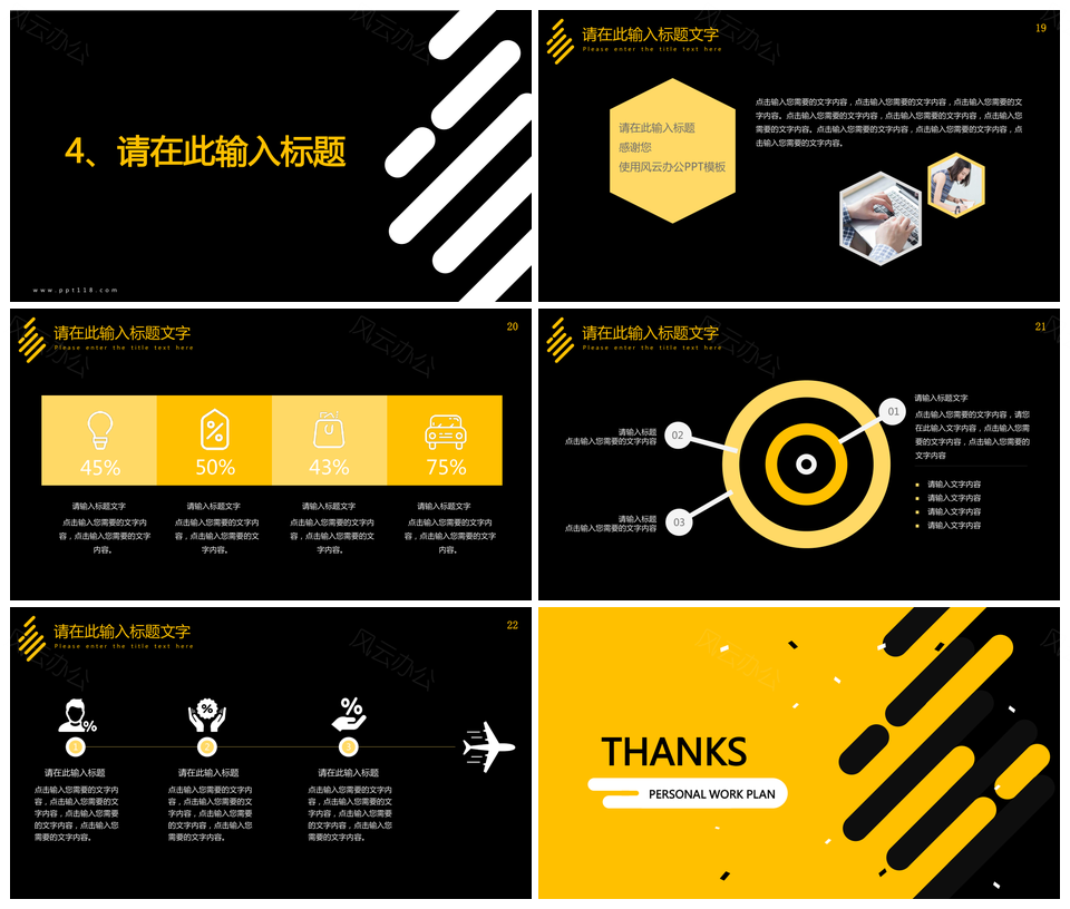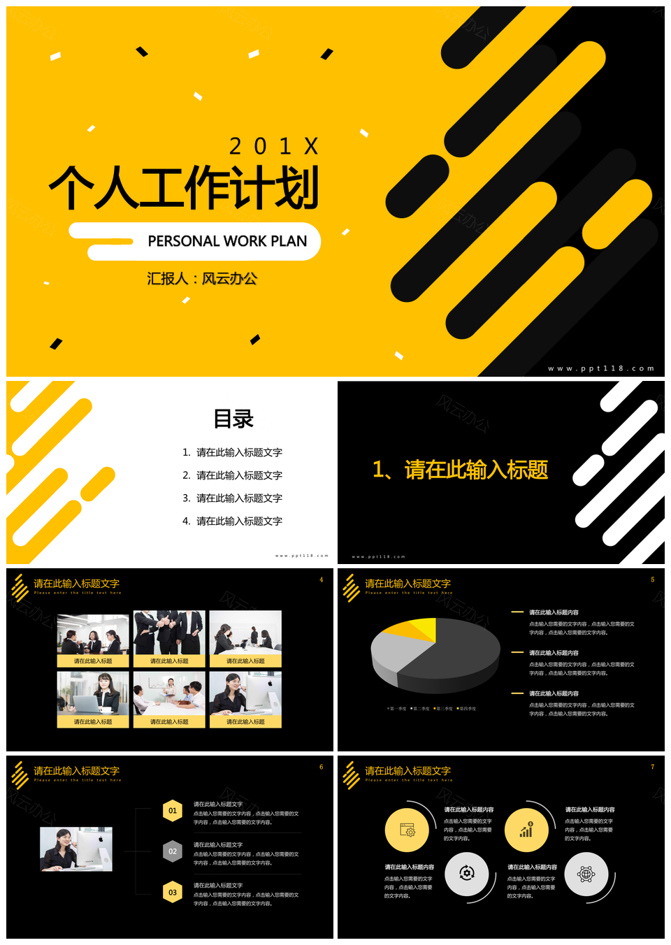 这是一张黄黑风个人工作计划PPT模板,包含黄黑风、个人、工作计划等主题内容,也可用作黄黑风、个人、工作、计划 黄黑风个人工作计划、黄黑风个人工作、黄黑风个人计划、黄黑风工作计划、个人工作计划、黄黑风个人、黄黑风工作、黄黑风计划、个人工作、个人计划、工作计划等PPT场景使用。 风云办公提供的黄黑风个人工作计划PPT模板,下载格式为pptx,一共20页,作品中文字及图均可以修改和编辑,图片更改请在作品中右键图片并更换,文字修改请直接点击文字进行修改。