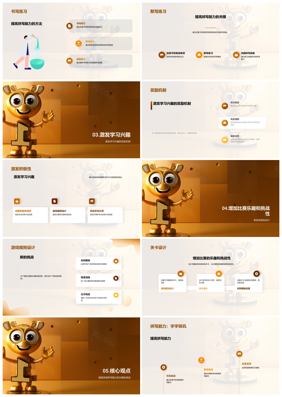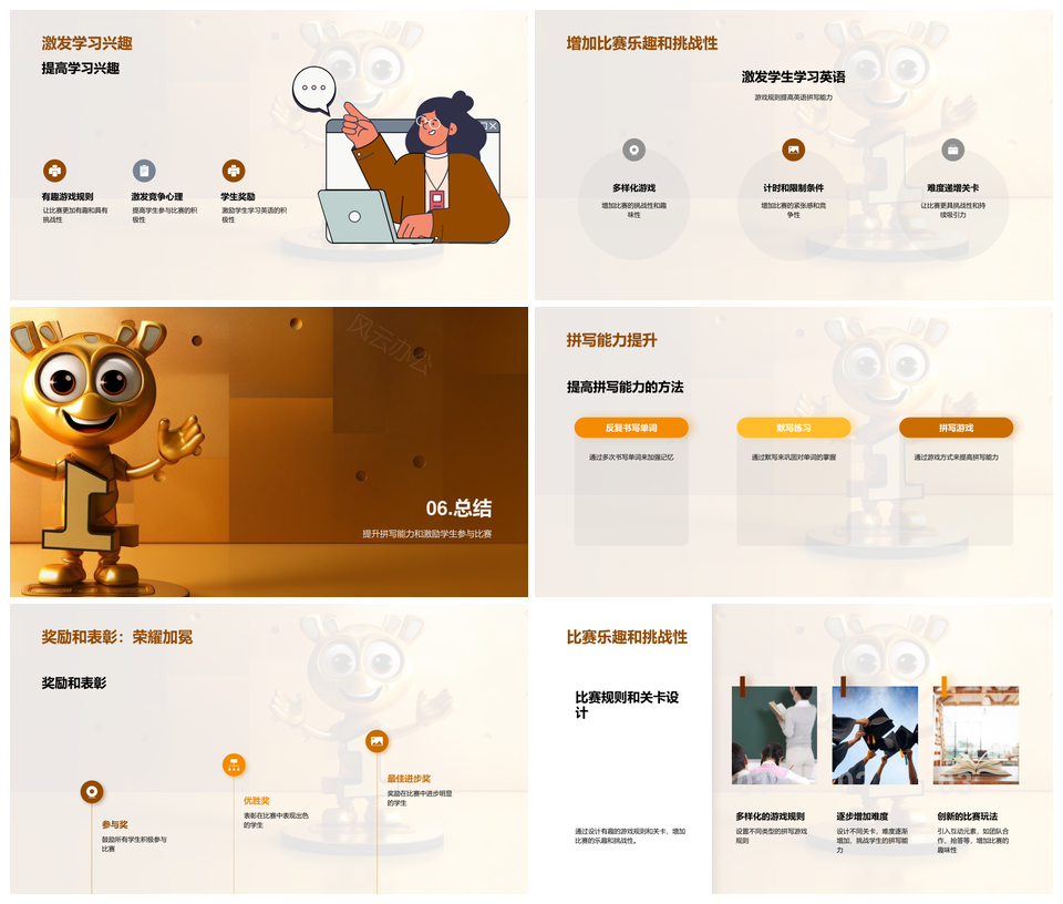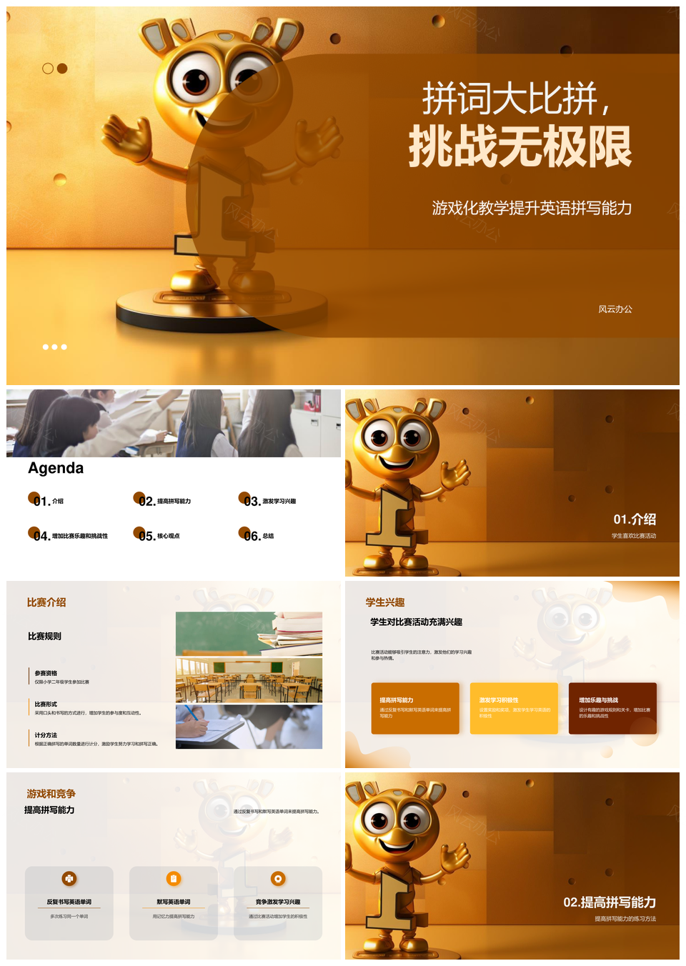 这是一张小学二年级英语拼词能力赛教学课件奖杯PPT模板,包含小学、二年级、英语、拼词、能力赛、教学课件、奖杯等主题内容,也可用作小学二年级英语拼词能力赛、二年级英语拼词能力赛教学课件、英语拼词能力赛教学课件奖杯、小学二年级英语拼词、二年级英语拼词能力赛、英语拼词能力赛教学、拼词能力赛教学课件、小学二年级英语、二年级英语拼词、英语拼词能力赛、拼词能力赛教学、能力赛教学课件、教学课件奖杯、小学二年级、二年级英语、英语拼词等PPT场景使用。 风云办公提供的小学二年级英语拼词能力赛教学课件奖杯PPT模板,下载格式为pptx,一共24页,作品中文字及图均可以修改和编辑,图片更改请在作品中右键图片并更换,文字修改请直接点击文字进行修改。