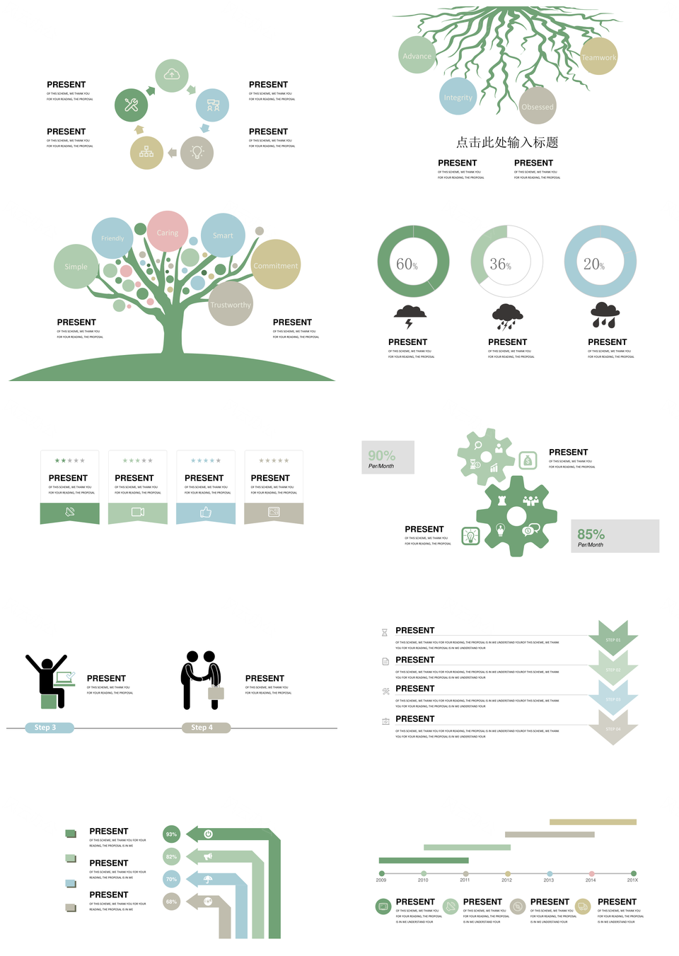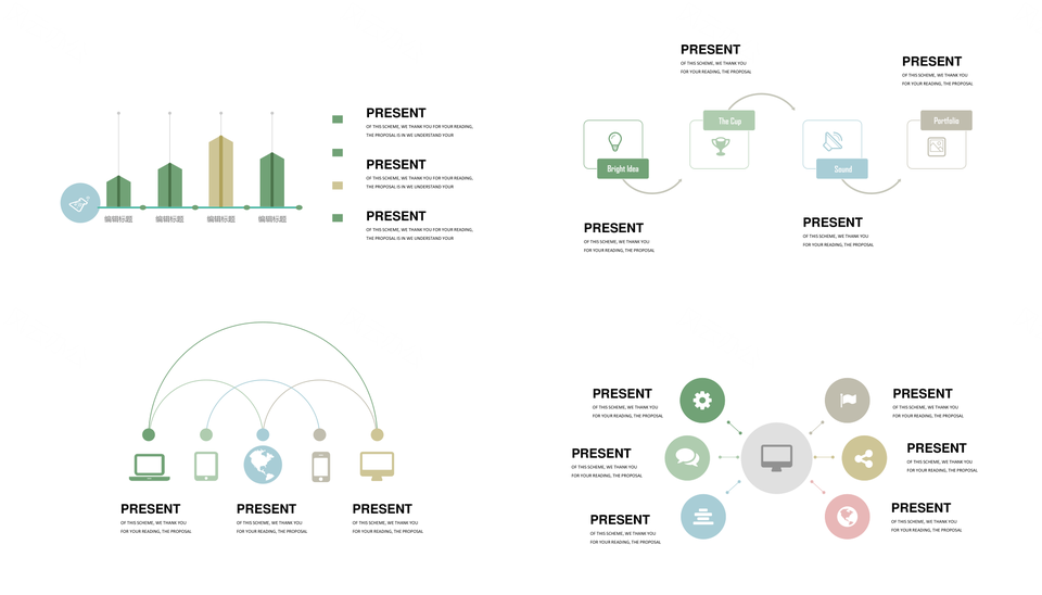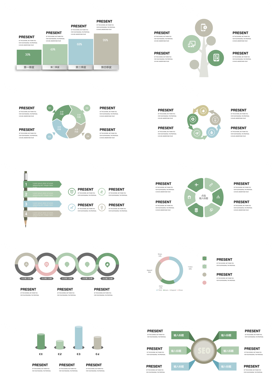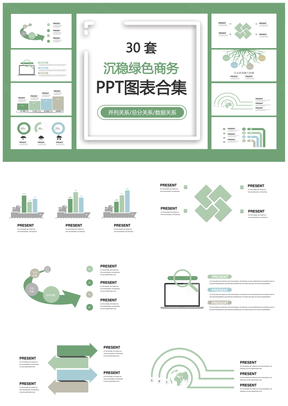沉稳绿色商务并列关系总分关系数据关系PPT图表合集推荐