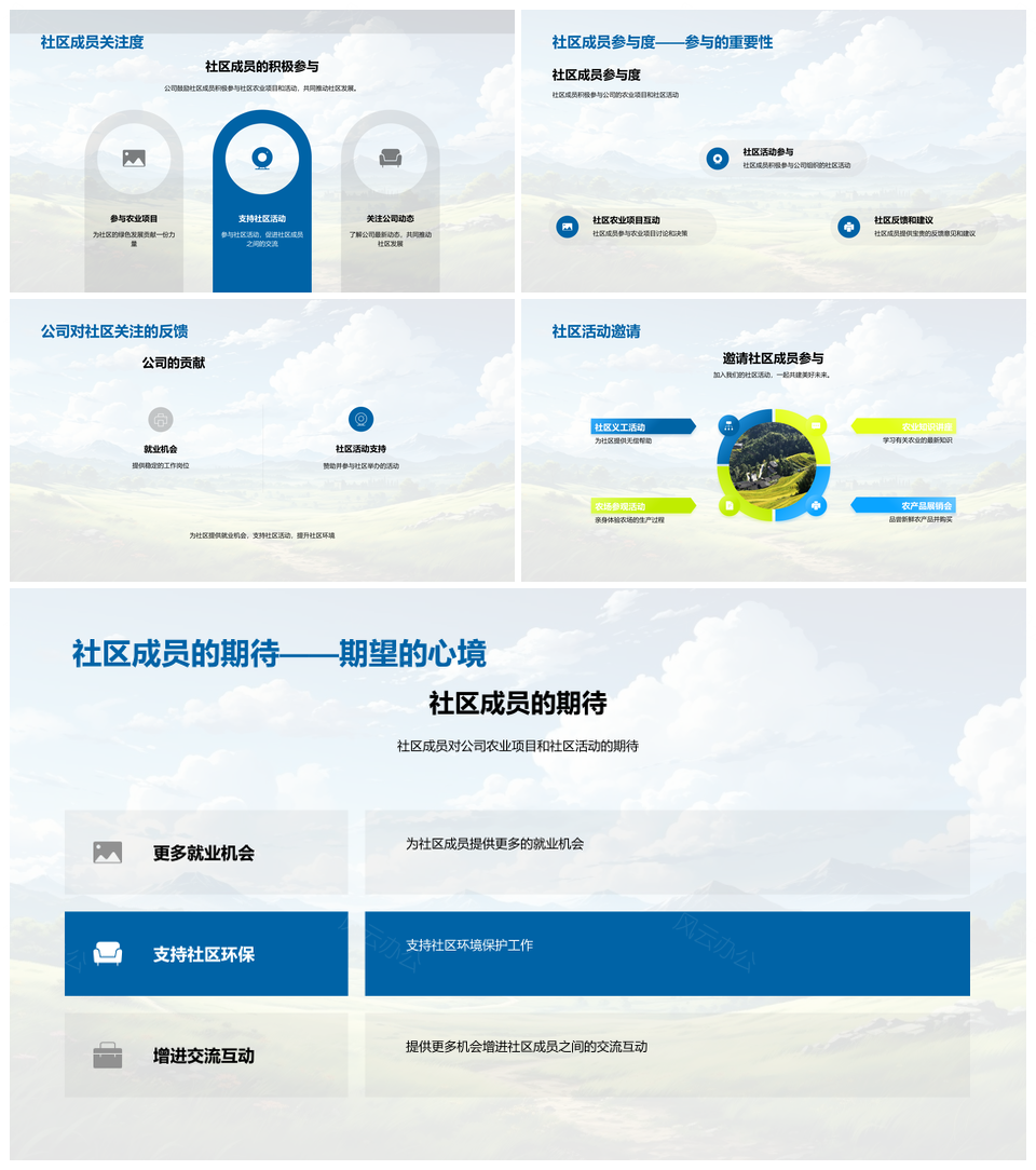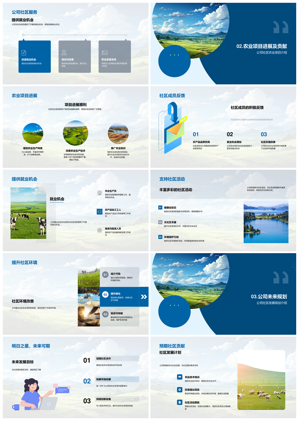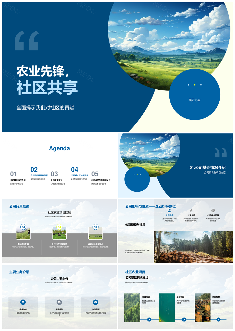 风云办公提供的农业项目共建社区发展促就业护环境PPT模板,下载格式为pptx,一共33页,作品中文字及图均可以修改和编辑,图片更改请在作品中右键图片并更换,文字修改请直接点击文字进行修改。