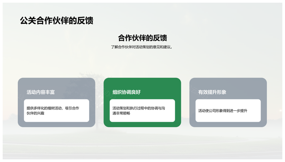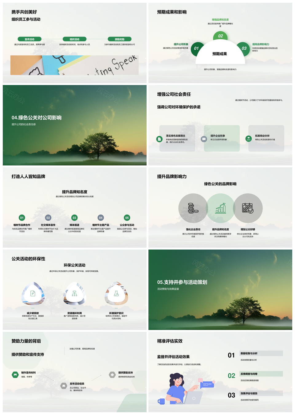 这是一张绿意盈盈植树节绿色公关活动树品牌社会责任PPT模板,包含绿意盈盈、植树节、绿色公关活动、树品牌、社会责任等主题内容,也可用作绿意盈盈植树节绿色公关活动、绿意盈盈植树节绿色公关、绿意盈盈绿色公关活动、植树节绿色公关活动、绿意盈盈植树节绿色、绿意盈盈绿色公关、绿色公关活动品牌、植树节绿色公关、绿色公关活动、绿意盈盈植树节、公关活动品牌、绿色公关品牌、活动品牌社会责任、植树节绿色、品牌社会责任等PPT场景使用。 风云办公提供的绿意盈盈植树节绿色公关活动树品牌社会责任PPT模板,下载格式为pptx,一共29页,作品中文字及图均可以修改和编辑,图片更改请在作品中右键图片并更换,文字修改请直接点击文字进行修改。