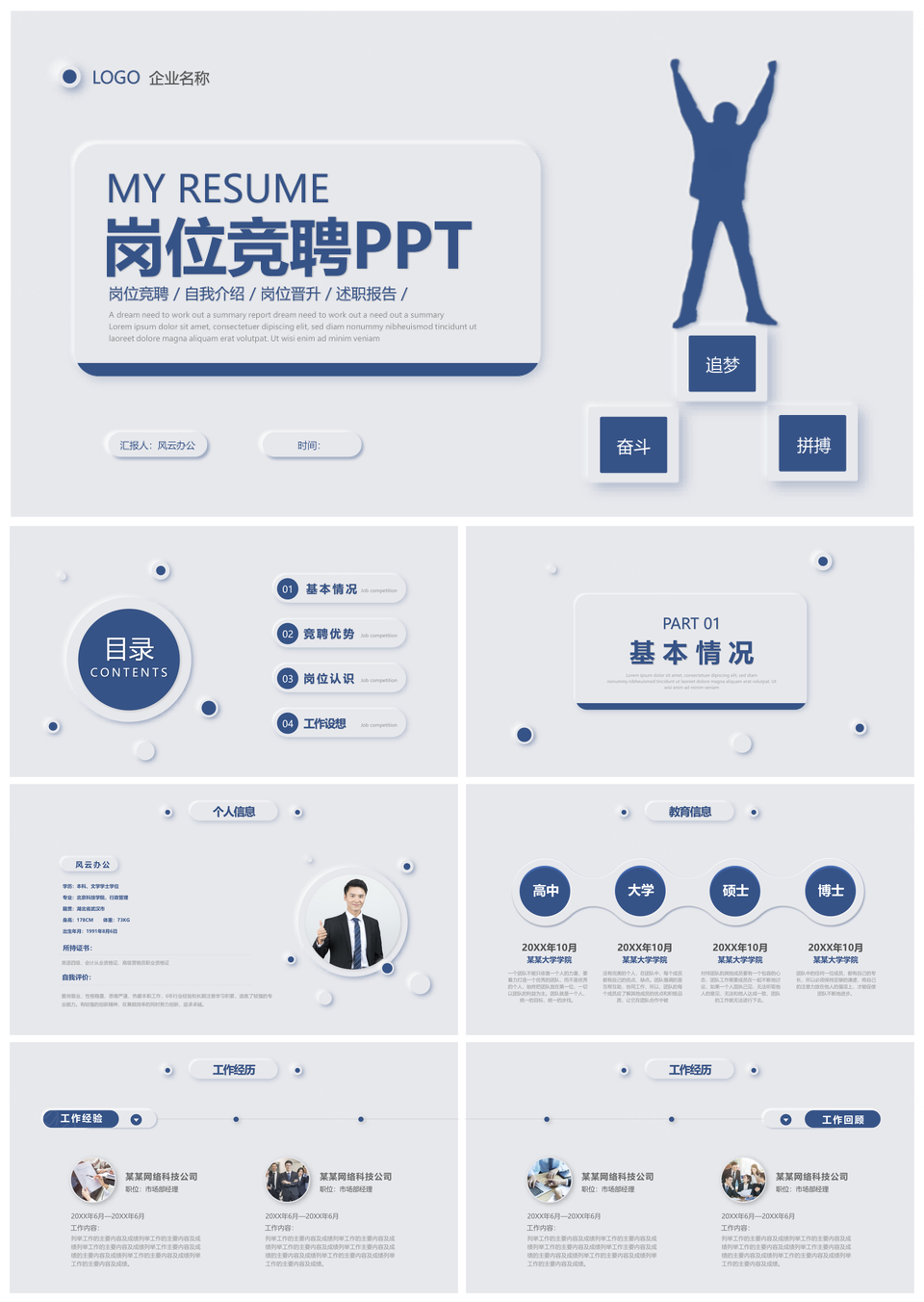 风云办公提供的蓝色简约新拟态岗位竞聘述职自我介绍ppt模板,下载格式为pptx,一共35页,作品中文字及图均可以修改和编辑,图片更改请在作品中右键图片并更换,文字修改请直接点击文字进行修改。
