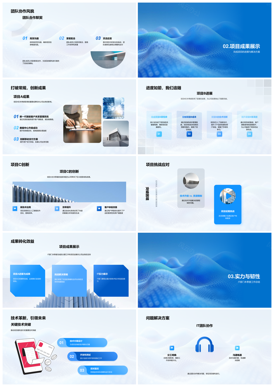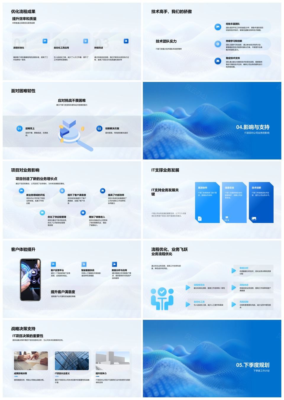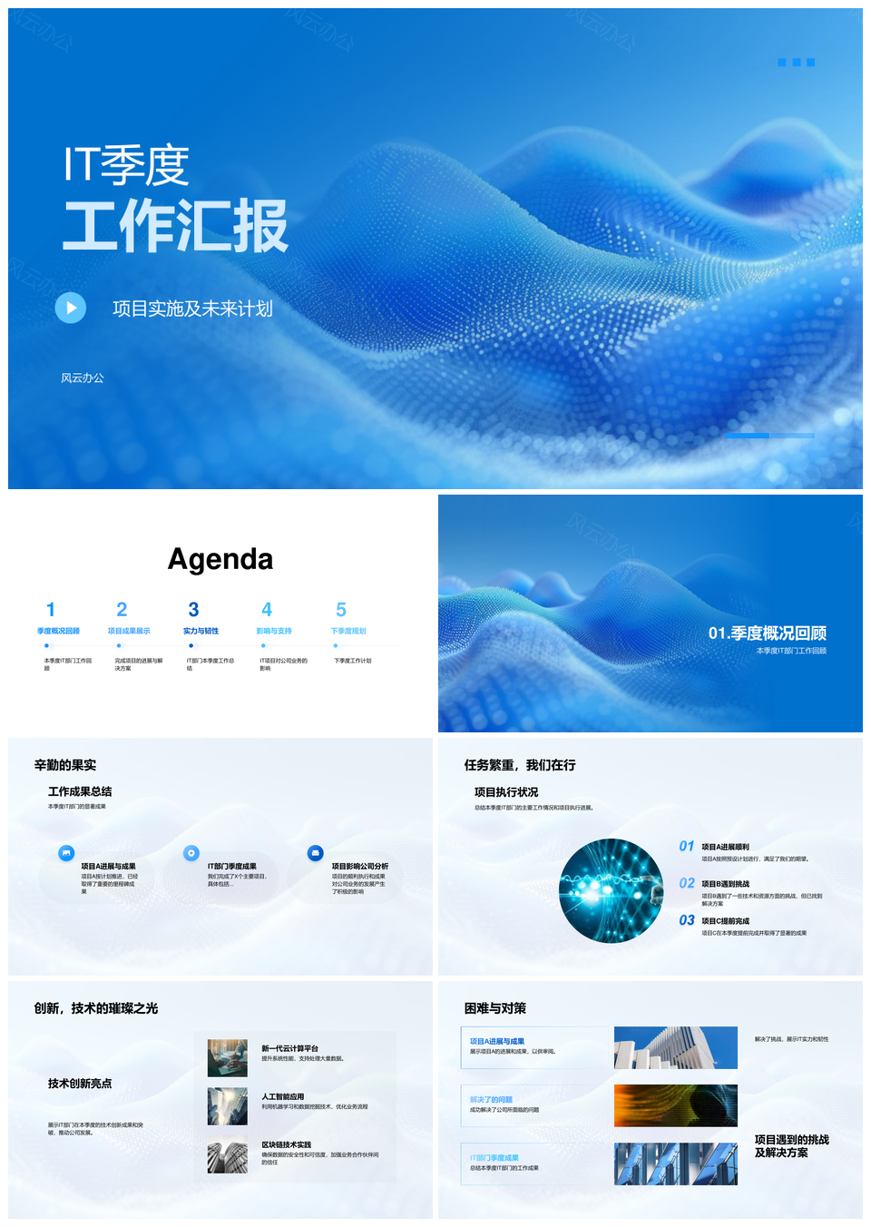 这是一张IT季度工作汇报项目实施成果技术创新未来计划PPT模板,包含IT、季度、工作、汇报、项目、实施、成果、技术、创新、未来、计划等主题内容,也可用作IT季度工作汇报项目、季度工作汇报项目实施、工作汇报项目实施成果、项目实施成果技术、实施成果技术创新、成果技术创新未来、技术创新未来计划、季度工作汇报项目、工作汇报项目实施、项目实施成果、实施成果技术、成果技术创新、技术创新未来、技术创未来计划、技术创新未来计划等PPT场景使用。 风云办公提供的IT季度工作汇报项目实施成果技术创新未来计划PPT模板,下载格式为pptx,一共33页,作品中文字及图均可以修改和编辑,图片更改请在作品中右键图片并更换,文字修改请直接点击文字进行修改。