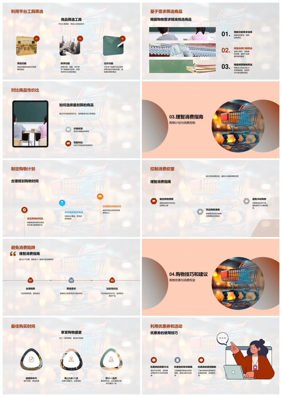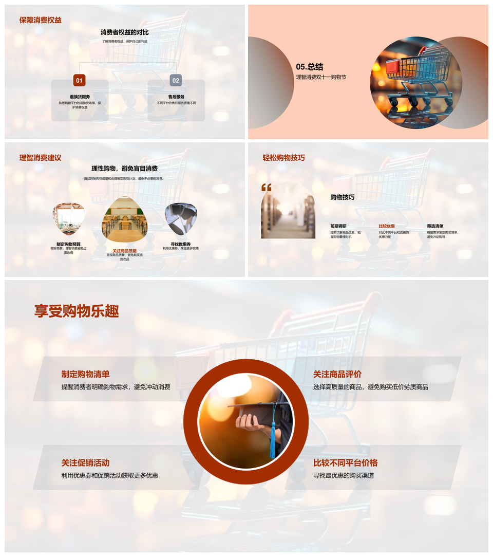 这是一张双十一智趣购物攻略优选计划PPT模板,包含双十一、智趣、购物、攻略、优选、计划等主题内容,也可用作双十一智趣购物攻略、智趣购物攻略优选、购物攻略优选计划、双十一智趣购物、智趣购物攻略、购物攻略优选、攻略优选计划、双十一智趣、智趣购物、购物攻略、攻略优选、优选计划等PPT场景使用。 风云办公提供的双十一智趣购物攻略优选计划PPT模板,下载格式为pptx,一共23页,作品中文字及图均可以修改和编辑,图片更改请在作品中右键图片并更换,文字修改请直接点击文字进行修改。