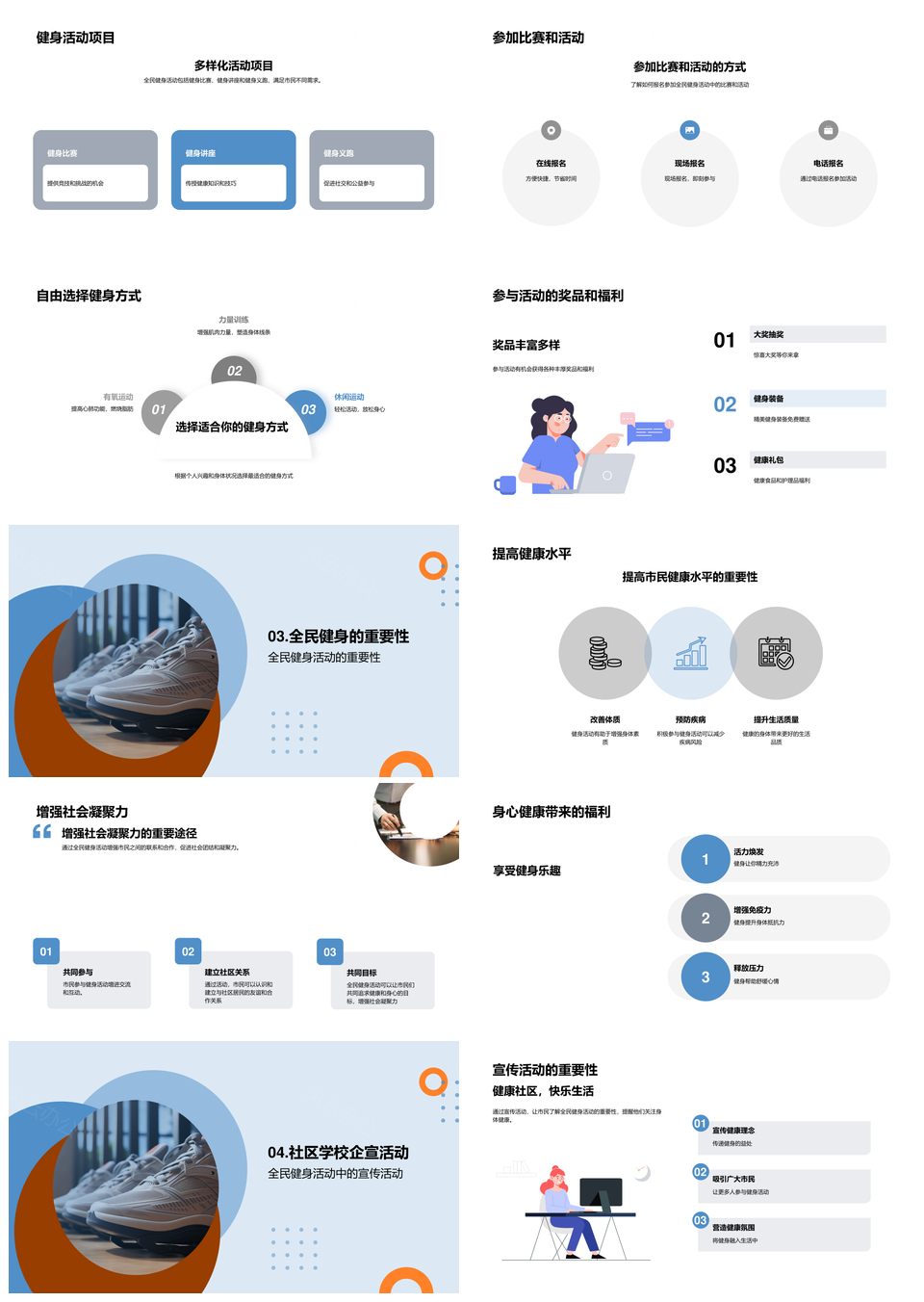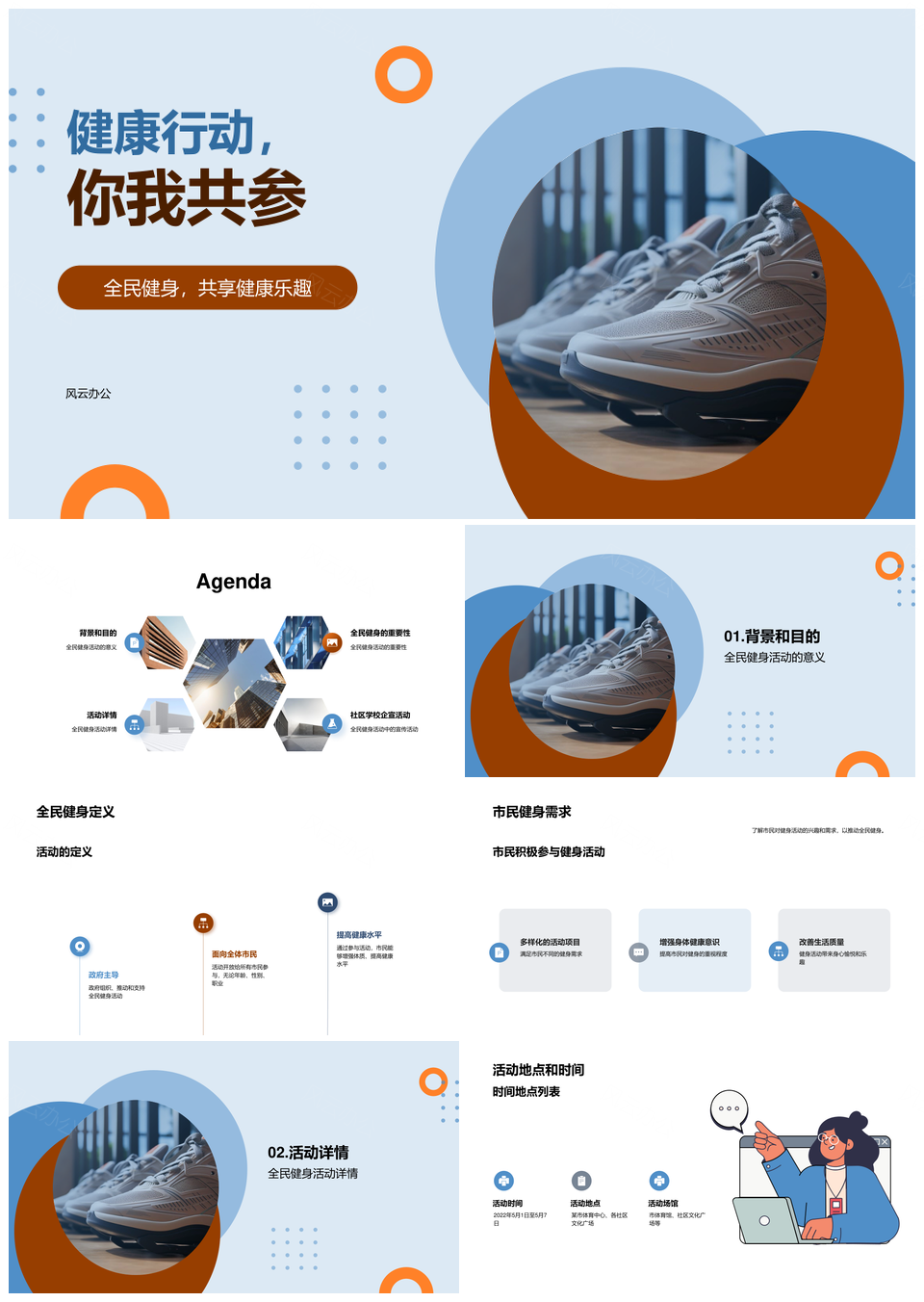 风云办公提供的全民健身活动推广市民共享乐趣参与PPT模板,下载格式为pptx,一共20页,作品中文字及图均可以修改和编辑,图片更改请在作品中右键图片并更换,文字修改请直接点击文字进行修改。