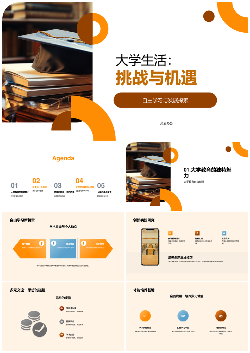 风云办公提供的大学生活挑战机遇自主创新多元发展PPT模板,下载格式为pptx,一共28页,作品中文字及图均可以修改和编辑,图片更改请在作品中右键图片并更换,文字修改请直接点击文字进行修改。