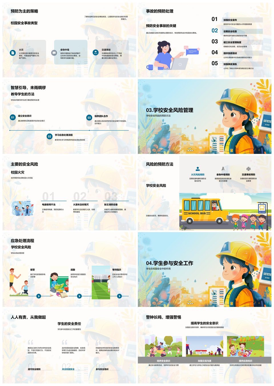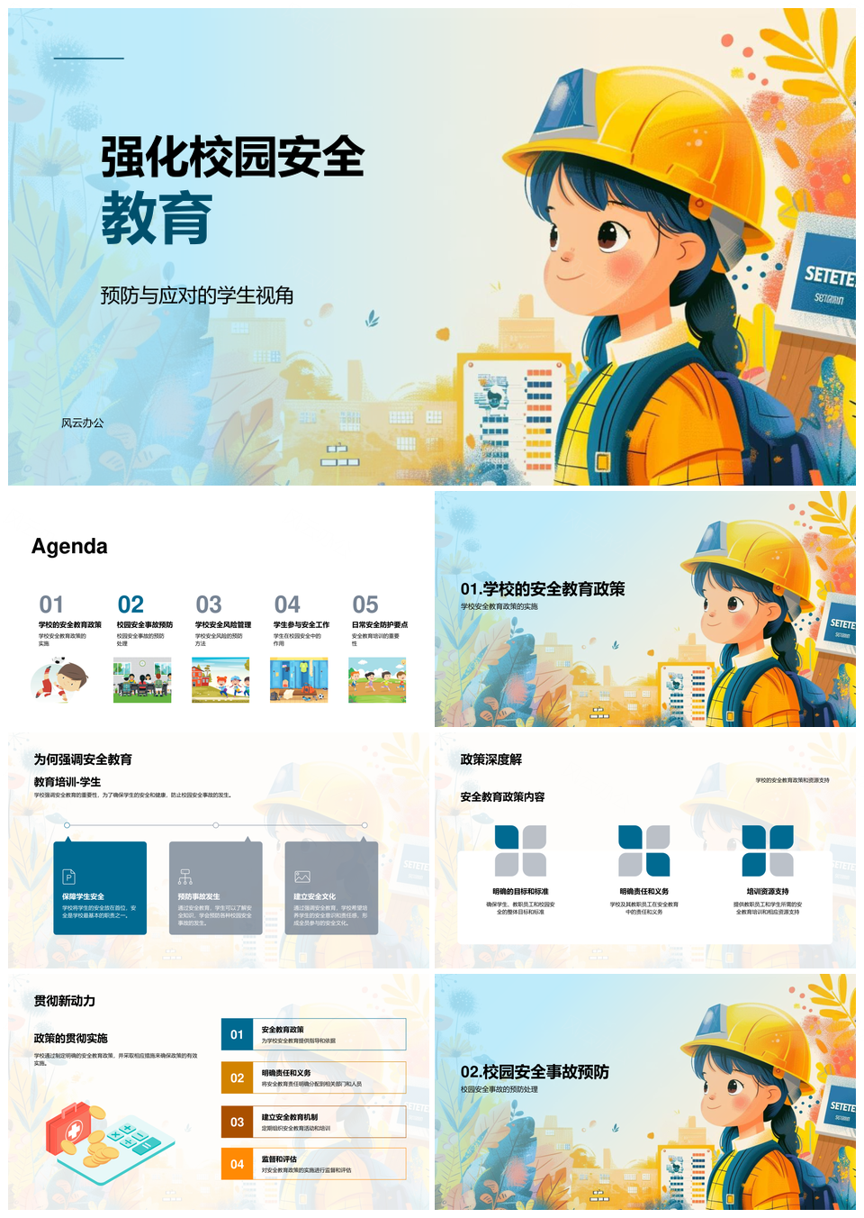 这是一张校园安全教育政策责任预防应急培训风险意识PPT模板,包含校园、安全教育、政策、责任、预防、应急、培训、风险意识等主题内容,也可用作校园安全教育政策、安全教育政策责任、政策责任预防应急、预防应急培训风险、应急培训风险意识、校园安全教育、安全教育政策、责任预防应急、应急培训风险、培训风险意识、校园安全、安全教育、教育政策、政策责任、责任预防、预防应急、应急培训、培训风险、风险意识等PPT场景使用。 风云办公提供的校园安全教育政策责任预防应急培训风险意识PPT模板,下载格式为pptx,一共23页,作品中文字及图均可以修改和编辑,图片更改请在作品中右键图片并更换,文字修改请直接点击文字进行修改。
