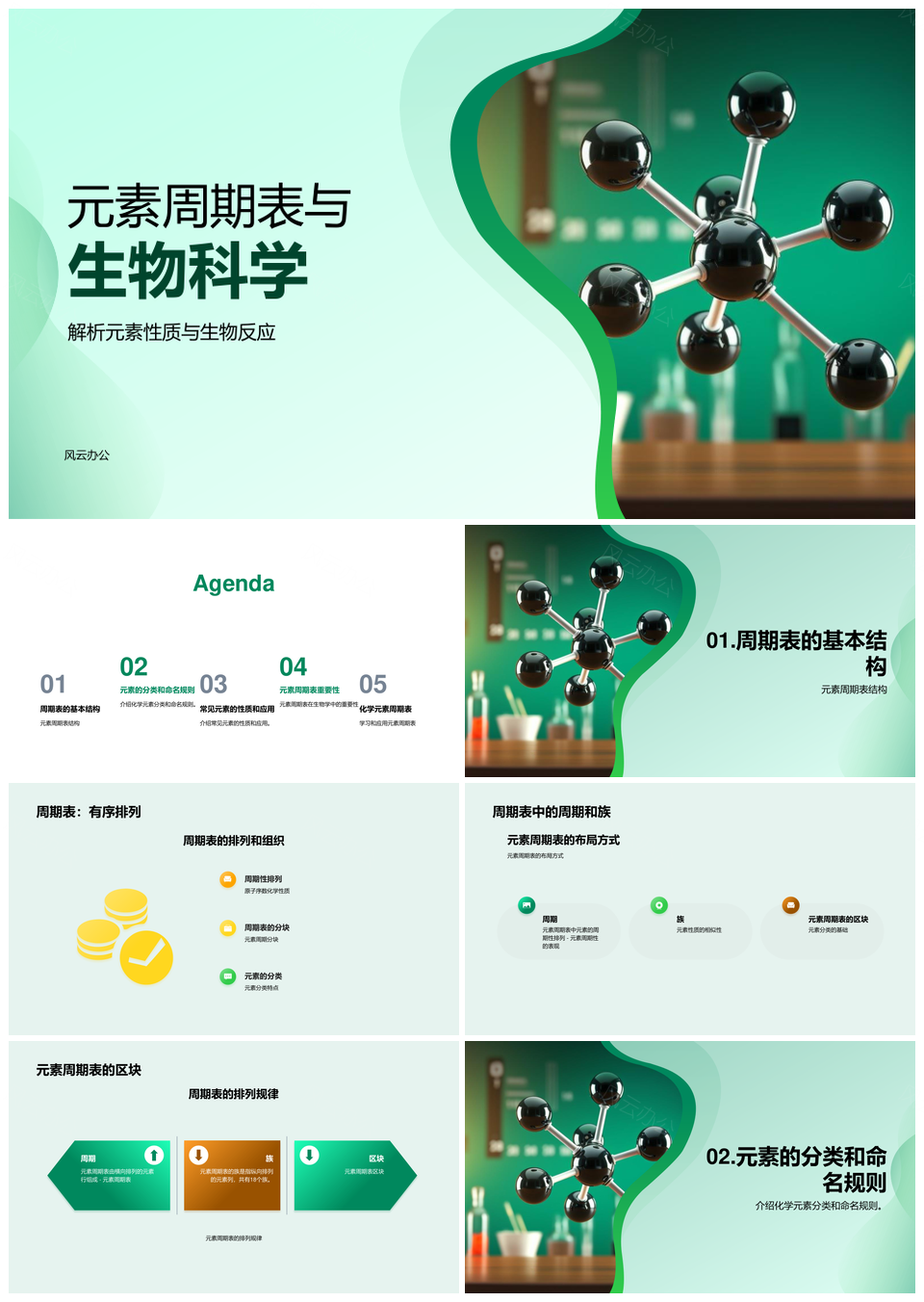 风云办公提供的元素周期表结构分类与生物科学应用PPT模板,下载格式为pptx,一共24页,作品中文字及图均可以修改和编辑,图片更改请在作品中右键图片并更换,文字修改请直接点击文字进行修改。