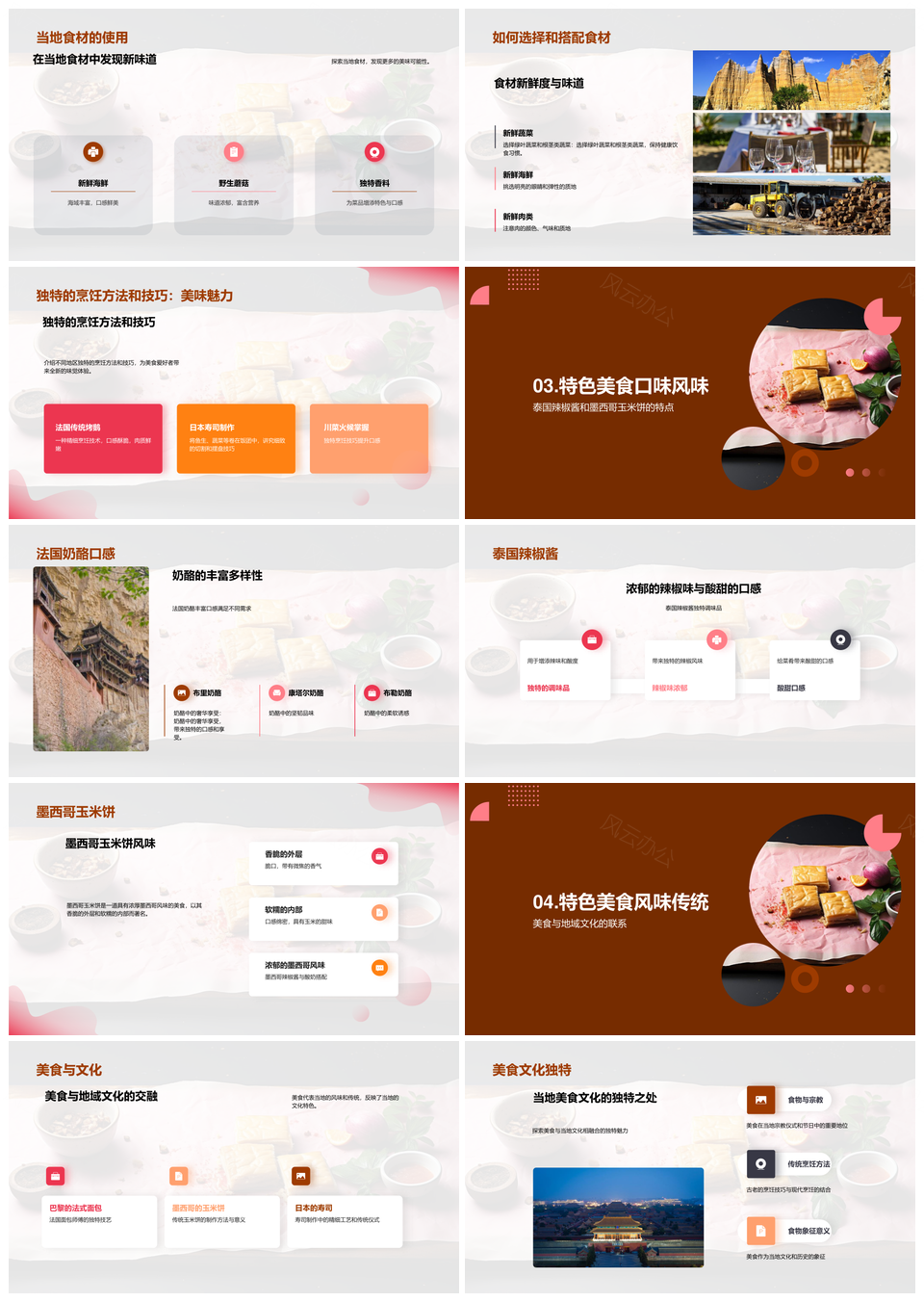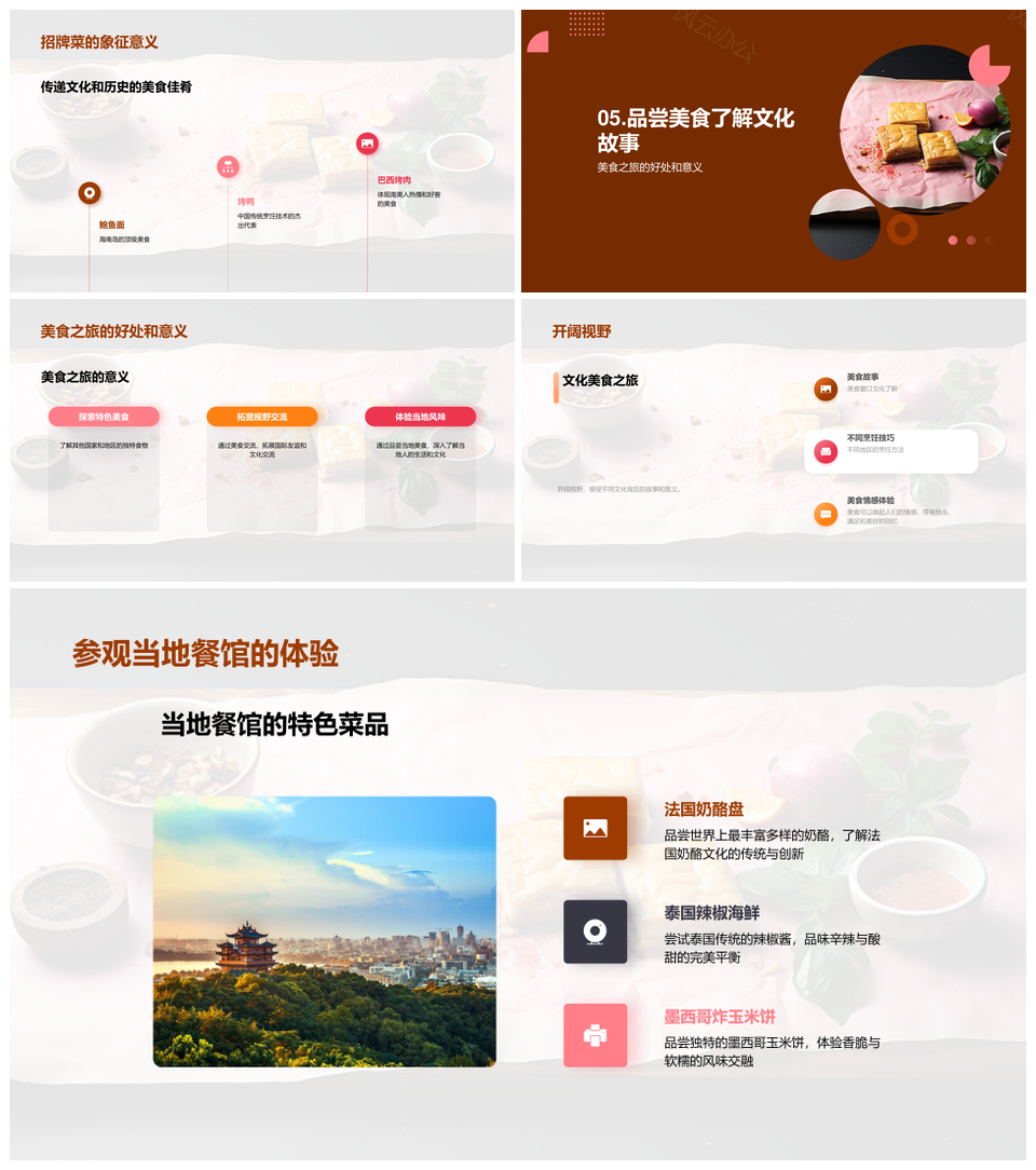 风云办公提供的世界美食家传统食旅巡游全球PPT模板,下载格式为pptx,一共23页,作品中文字及图均可以修改和编辑,图片更改请在作品中右键图片并更换,文字修改请直接点击文字进行修改。