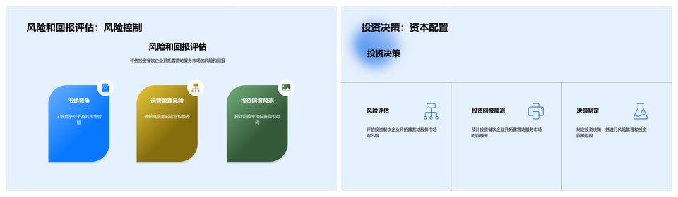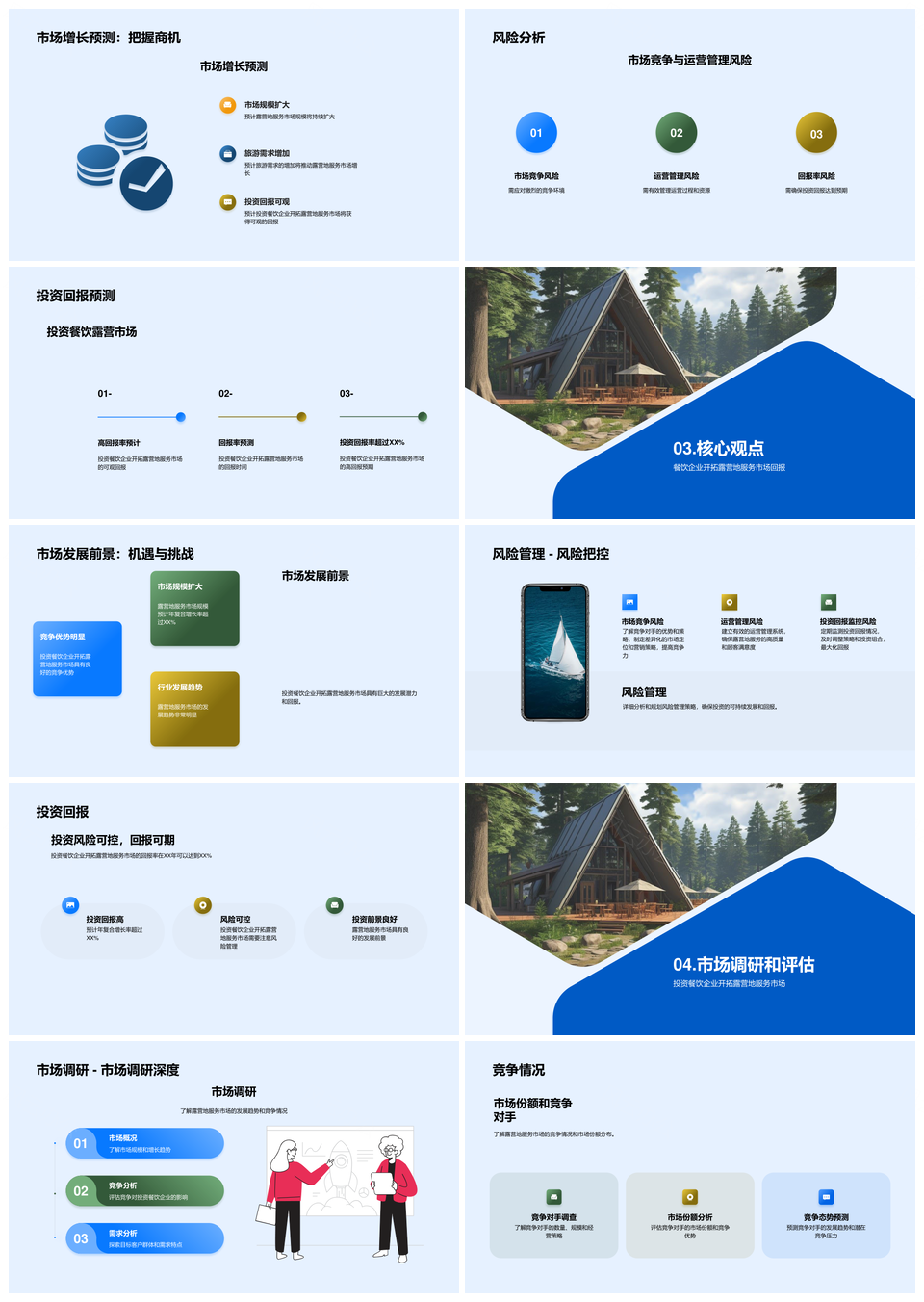这是一张餐饮业露营地服务市场投资分析及回报预测PPT模板,包含餐饮业、露营地、服务市场、投资分析、回报预测等主题内容,也可用作餐饮业露营地服务市场投资分析回报预测、餐饮业露营地服务市场、露营地服务市场投资分析、服务市场投资分析回报、市场投资分析回报预测、餐饮业露营地服务、露营地服务市场投资、服务市场投资分析、市场投资分析回报、投资分析回报预测、餐饮业露营地、露营地服务市场、服务市场投资、市场投资分析、投资分析回报等PPT场景使用。 风云办公提供的餐饮业露营地服务市场投资分析及回报预测PPT模板,下载格式为pptx,一共20页,作品中文字及图均可以修改和编辑,图片更改请在作品中右键图片并更换,文字修改请直接点击文字进行修改。