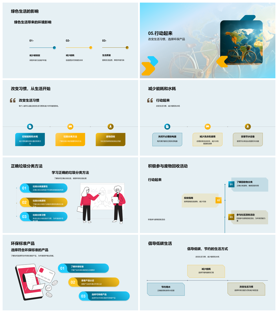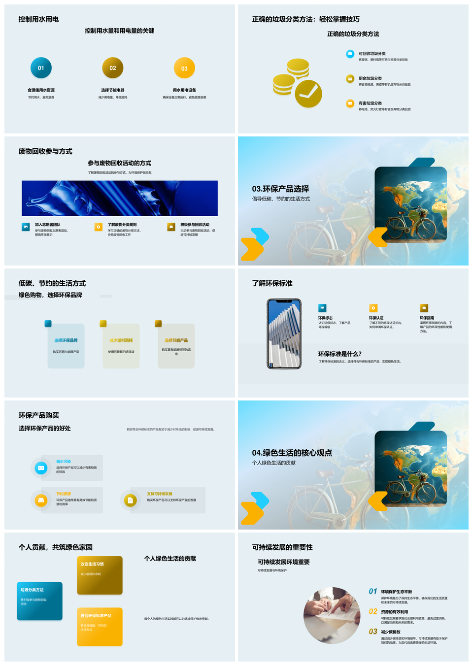 这是一张社区居民节水节电分类回收骑行践行绿色生活PPT模板,包含社区居民、节水、节电、分类回收、骑行、践行、绿色生活等主题内容,也可用作社区居民节水节电、节水节电分类回收、分类回收骑行践行、居民节水节电、节水节电分类、分类回收骑行、骑行践行绿色生活、社区居民、节水节电、分类回收、骑行践行、践行绿色生活、居民节水、节电分类、回收骑行等PPT场景使用。 风云办公提供的社区居民节水节电分类回收骑行践行绿色生活PPT模板,下载格式为pptx,一共26页,作品中文字及图均可以修改和编辑,图片更改请在作品中右键图片并更换,文字修改请直接点击文字进行修改。
