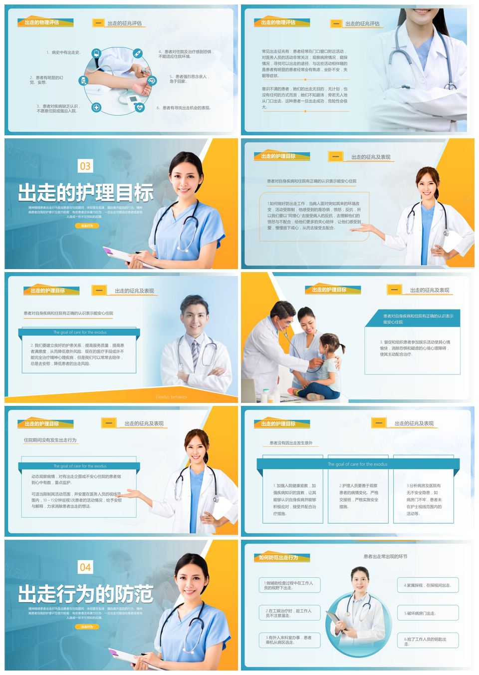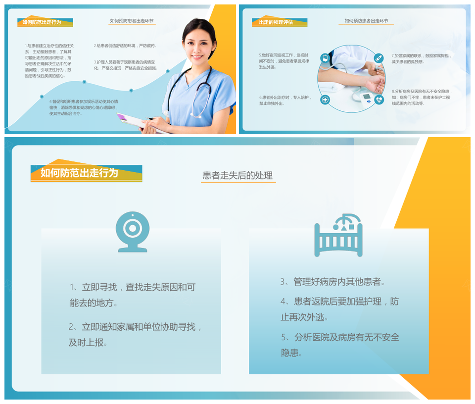 这是一张商务医务出走防范护理培训课件,包含商务、医务、出走、防范、护理、培训、课件等主题内容,也可用作防范护理培训课件、商务医务防范护理、医务护理培训课件、防范护理培训、护理培训课件、商务医务培训、商务防范护理、出走防范护理、医务护理培训、商务医务、防范护理、护理培训、培训课件、医务护理、出走防范等PPT场景使用。 风云办公提供的商务医务出走防范护理培训课件,下载格式为pptx,一共21页,作品中文字及图均可以修改和编辑,图片更改请在作品中右键图片并更换,文字修改请直接点击文字进行修改。
