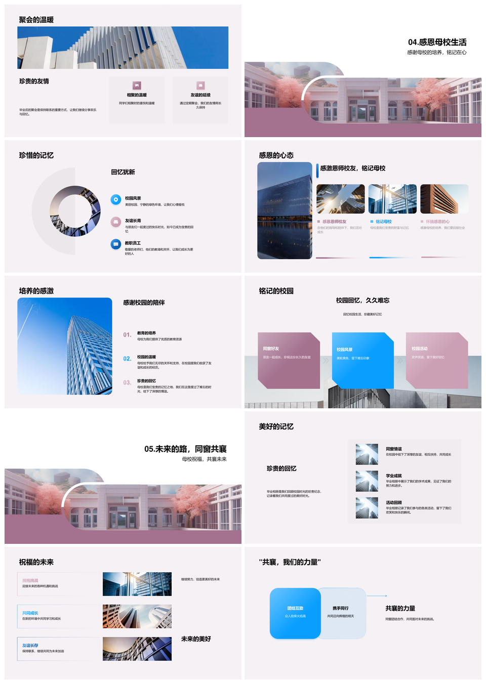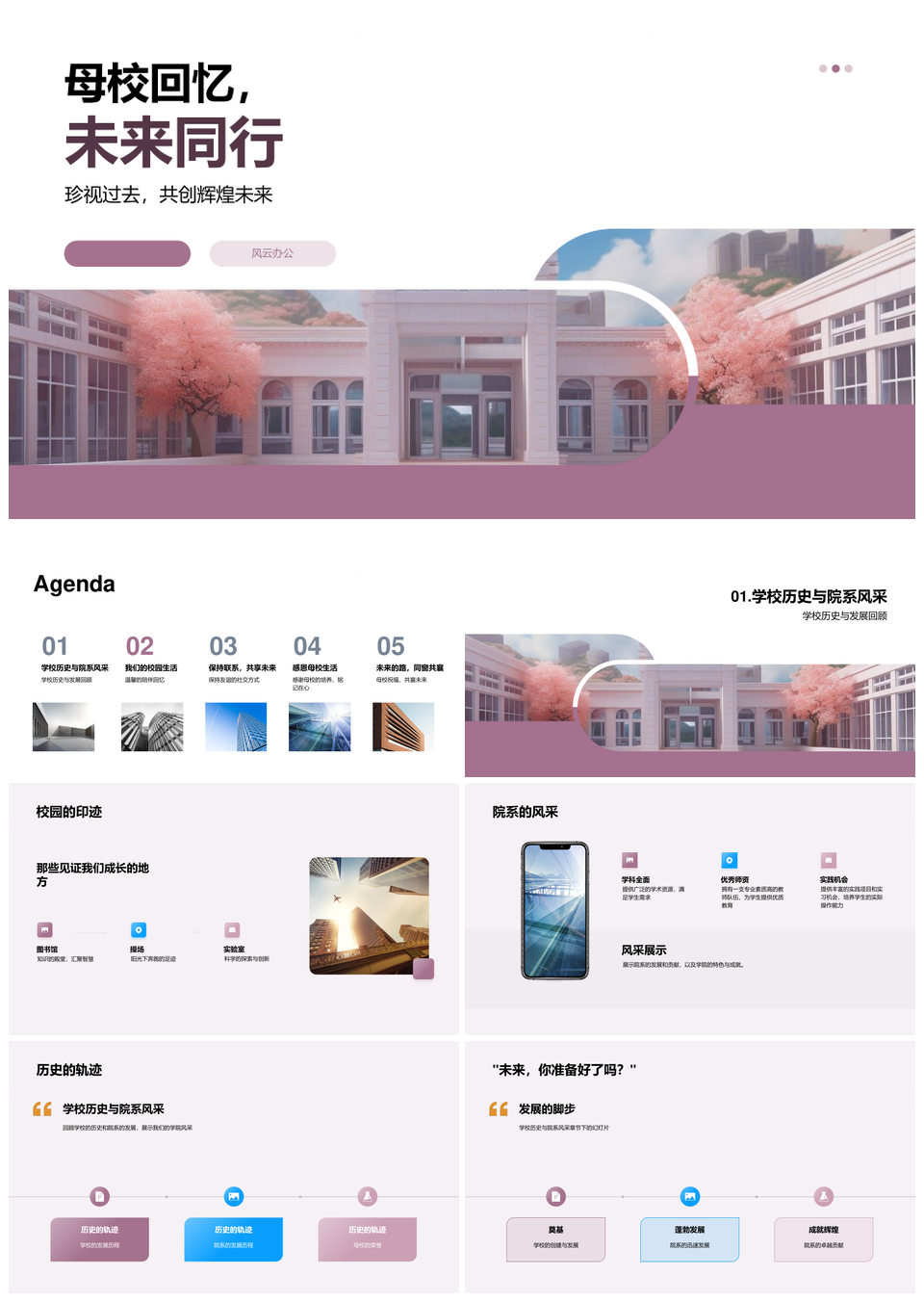 风云办公提供的母校回忆未来同行校史院风情谊永存PPT模板,下载格式为pptx,一共29页,作品中文字及图均可以修改和编辑,图片更改请在作品中右键图片并更换,文字修改请直接点击文字进行修改。