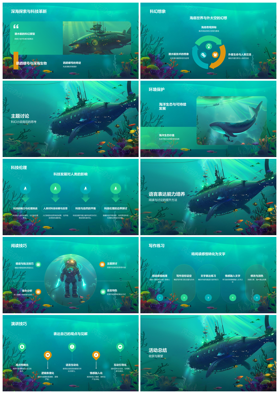 风云办公提供的海底两万里科幻文学读书分享学习活动PPT模板,下载格式为pptx,一共19页,作品中文字及图均可以修改和编辑,图片更改请在作品中右键图片并更换,文字修改请直接点击文字进行修改。
