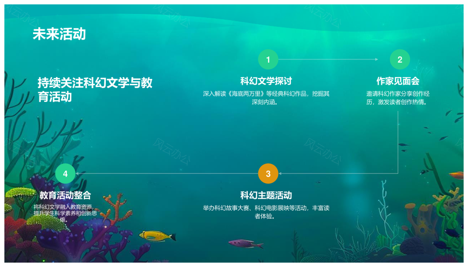 这是一张海底两万里科幻文学读书分享学习活动PPT模板,包含海底两万里、科幻文学、读书分享、学习活动等主题内容,也可用作海底两万里科幻文学读书分享、科幻文学读书分享学习、读书分享学习活动、海底两万里科幻文学、海底两万里读书分享、科幻文学读书、文学读书分享、读书分享学习、分享学习活动、海底两万里科幻、科幻读书分享、文学学习活动、读书分享活动、科幻文学学习、读书学习活动等PPT场景使用。