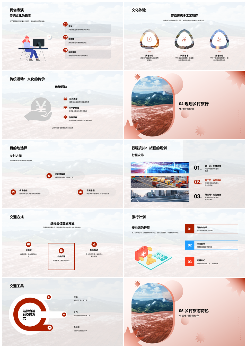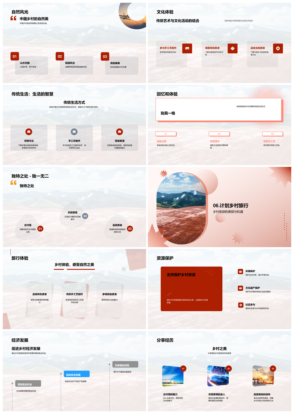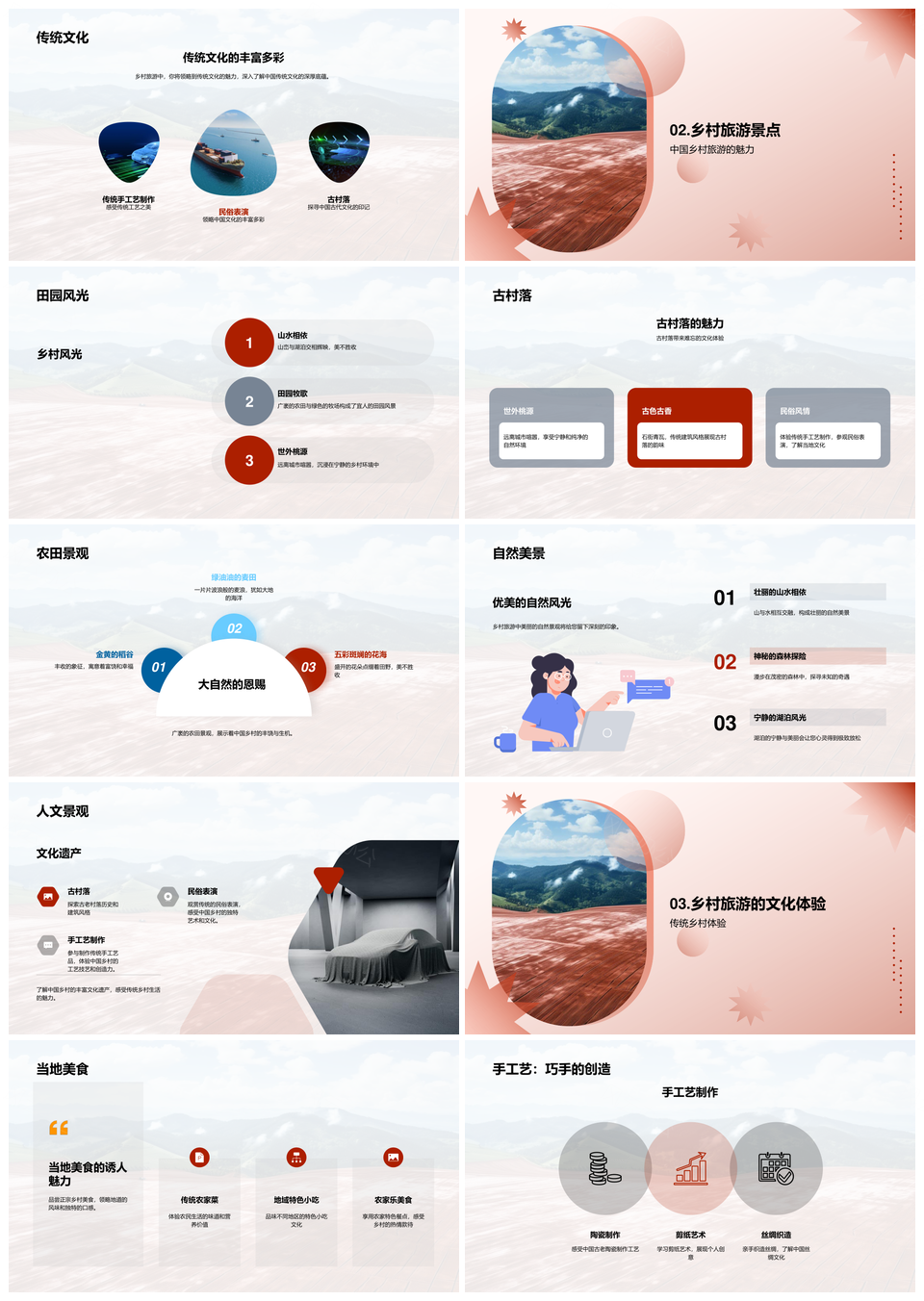这是一张中国乡村旅游自然风光传统文化古村美食PPT模板,包含乡村旅游、自然风光、传统文化、古村、美食等主题内容,也可用作中国乡村旅游自然风光、自然风光传统文化古村美食、中国乡村旅游传统文化、乡村旅游自然风光古村、中国传统文化古村美食、中国乡村自然风光旅游、乡村旅游自然风光、传统文化古村美食、中国乡村自然风光、自然风光古村美食、乡村旅游传统文化、中国传统文化美食、乡村旅游、自然风光、传统文化、古村美食等PPT场景使用。 风云办公提供的中国乡村旅游自然风光传统文化古村美食PPT模板,下载格式为pptx,一共39页,作品中文字及图均可以修改和编辑,图片更改请在作品中右键图片并更换,文字修改请直接点击文字进行修改。