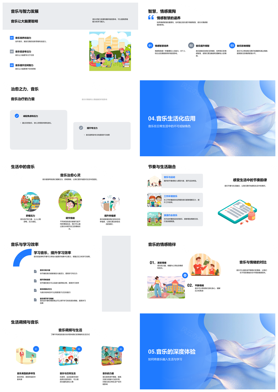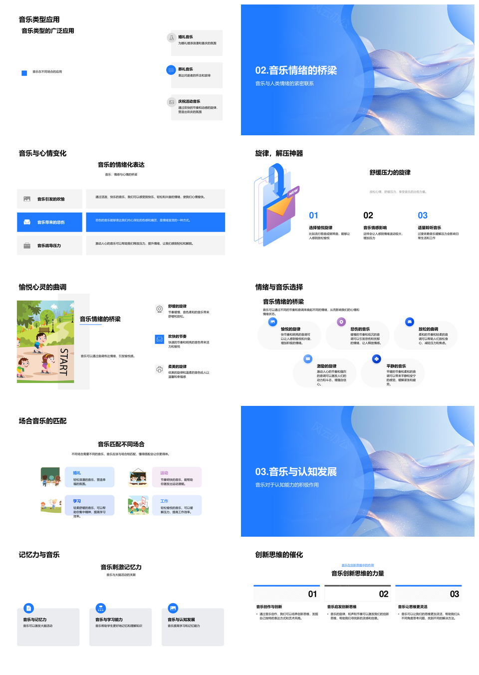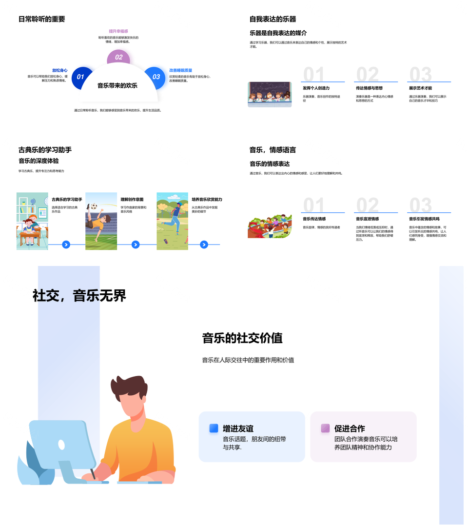 风云办公提供的音乐课堂实践教学元素类型及心理健康PPT模板,下载格式为pptx,一共33页,作品中文字及图均可以修改和编辑,图片更改请在作品中右键图片并更换,文字修改请直接点击文字进行修改。