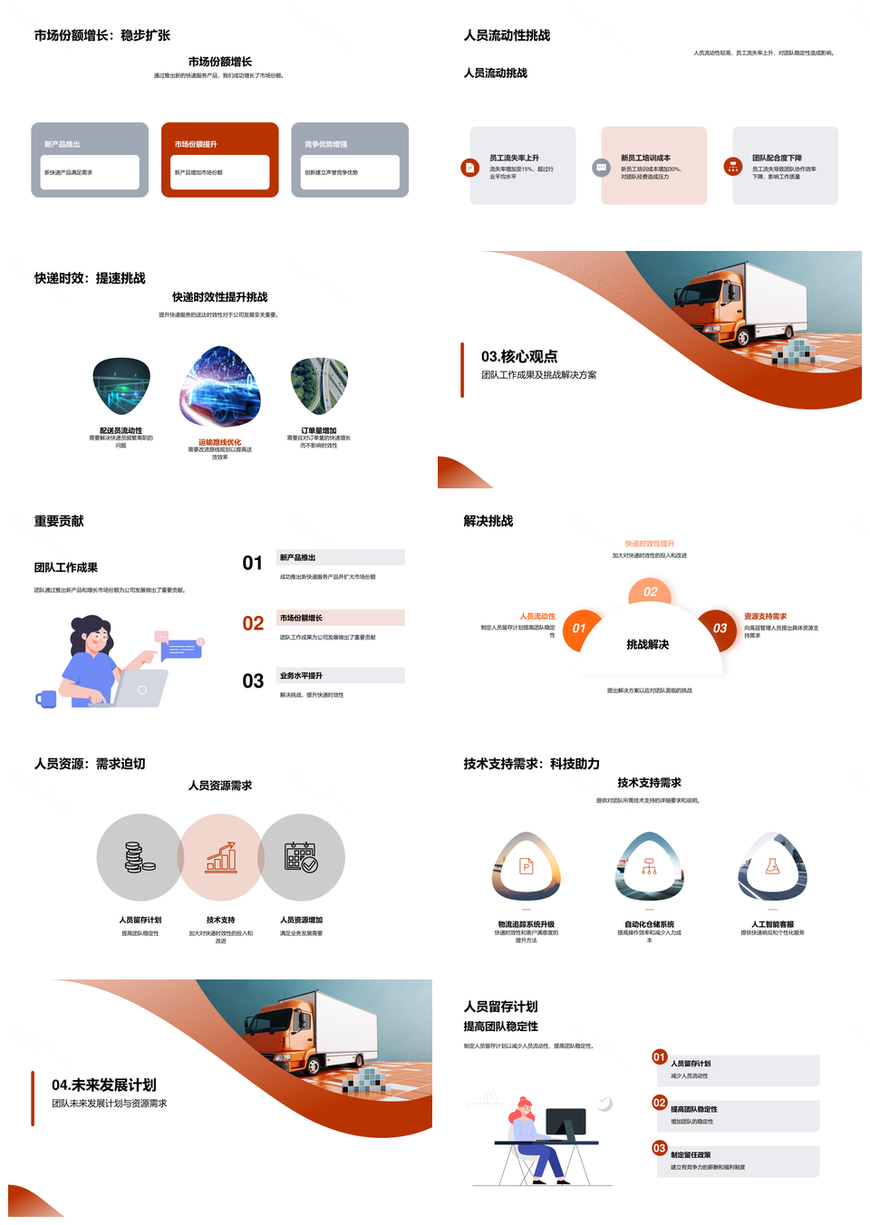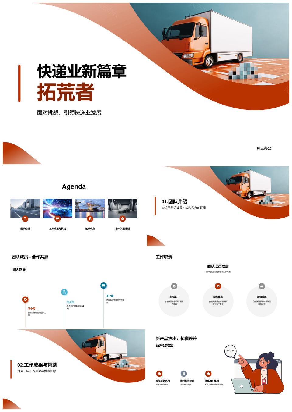 风云办公提供的快递团队拓荒新品卡车增份额PPT模板,下载格式为pptx,一共20页,作品中文字及图均可以修改和编辑,图片更改请在作品中右键图片并更换,文字修改请直接点击文字进行修改。