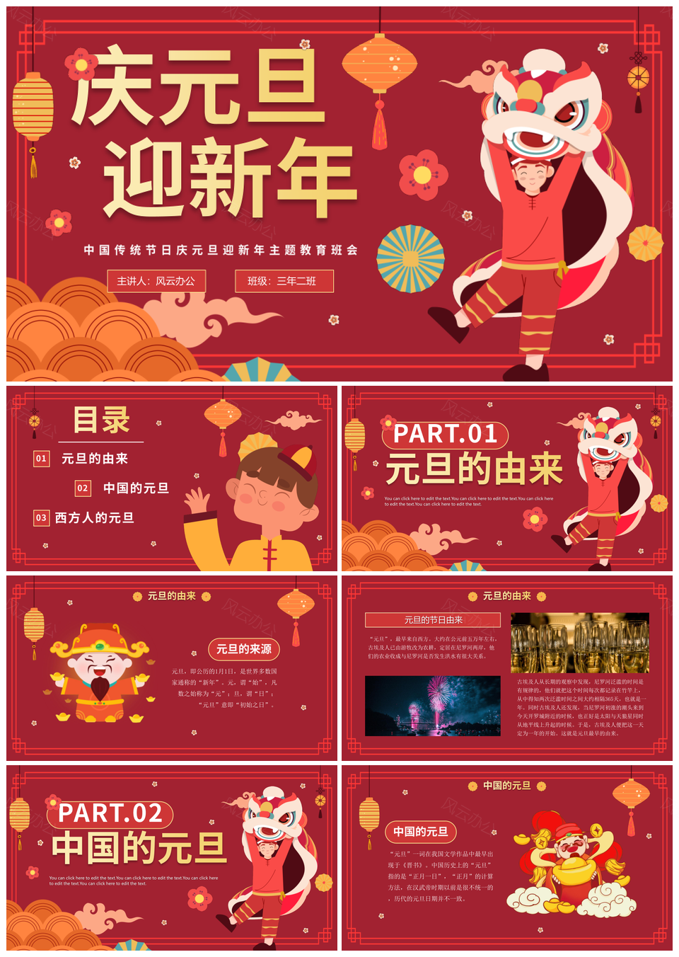 风云办公提供的红色卡通手绘元旦迎新年主题班会PPT模板,下载格式为pptx,一共19页,作品中文字及图均可以修改和编辑,图片更改请在作品中右键图片并更换,文字修改请直接点击文字进行修改。