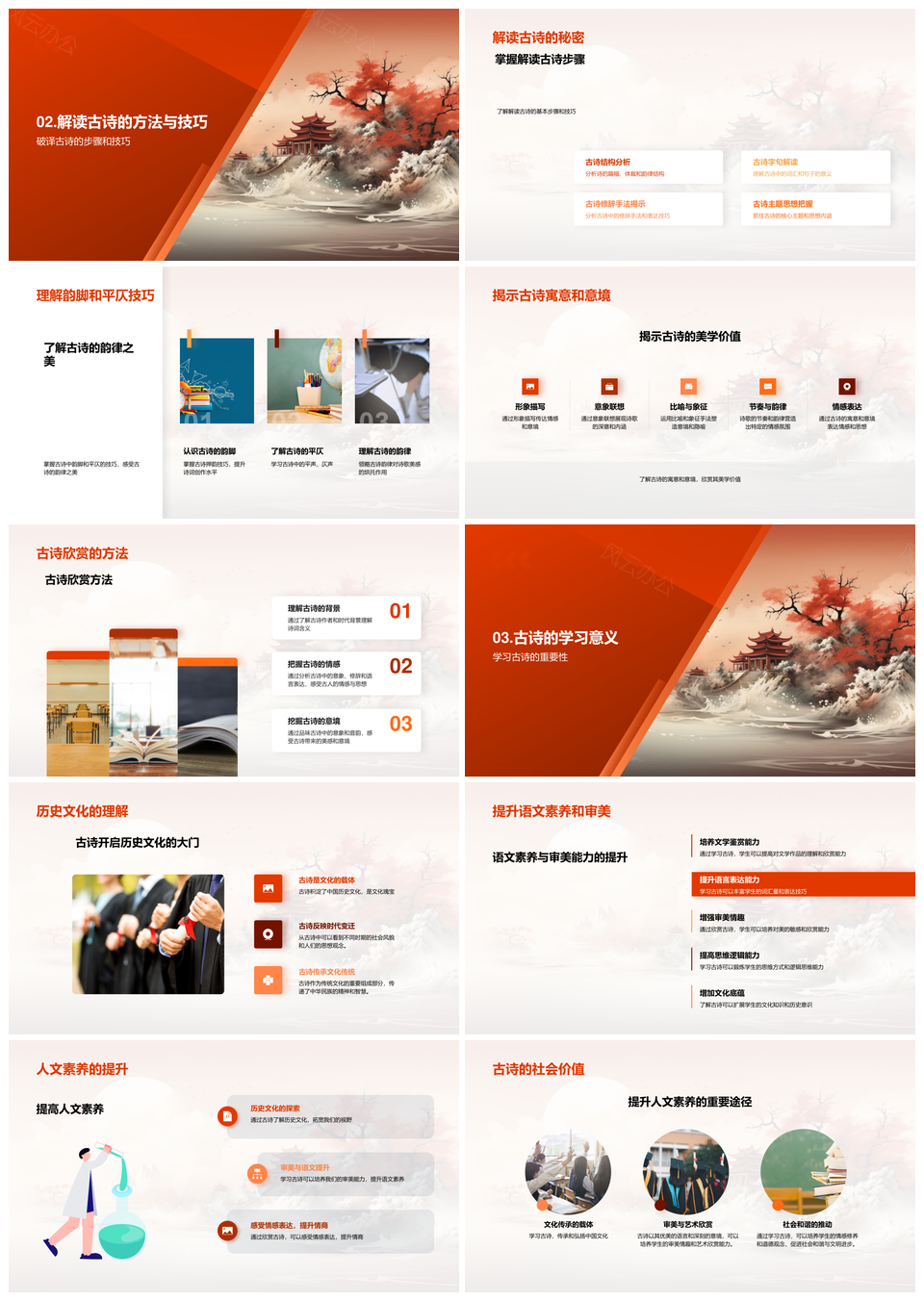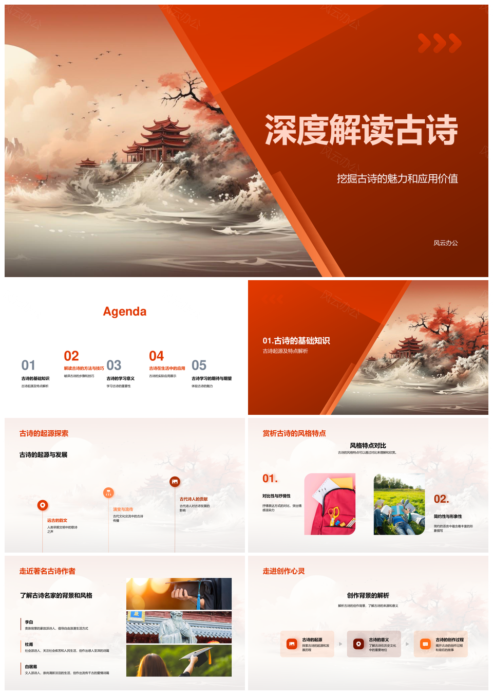 风云办公提供的古诗魅力起源风格作者生平卷轴探析PPT模板,下载格式为pptx,一共26页,作品中文字及图均可以修改和编辑,图片更改请在作品中右键图片并更换,文字修改请直接点击文字进行修改。