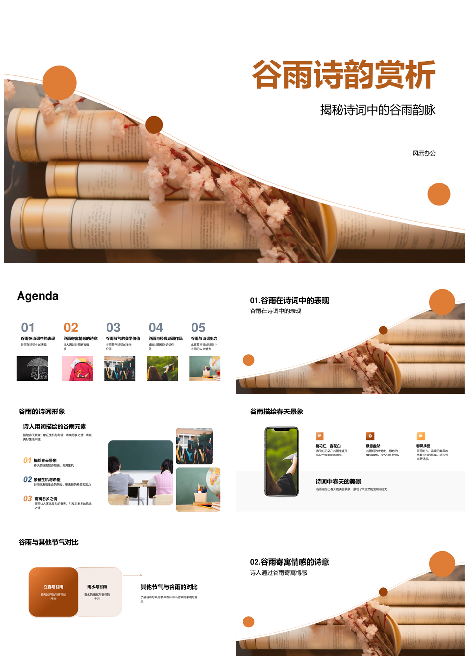 风云办公提供的谷雨诗韵赏析春景生机希望古卷PPT模板,下载格式为pptx,一共23页,作品中文字及图均可以修改和编辑,图片更改请在作品中右键图片并更换,文字修改请直接点击文字进行修改。