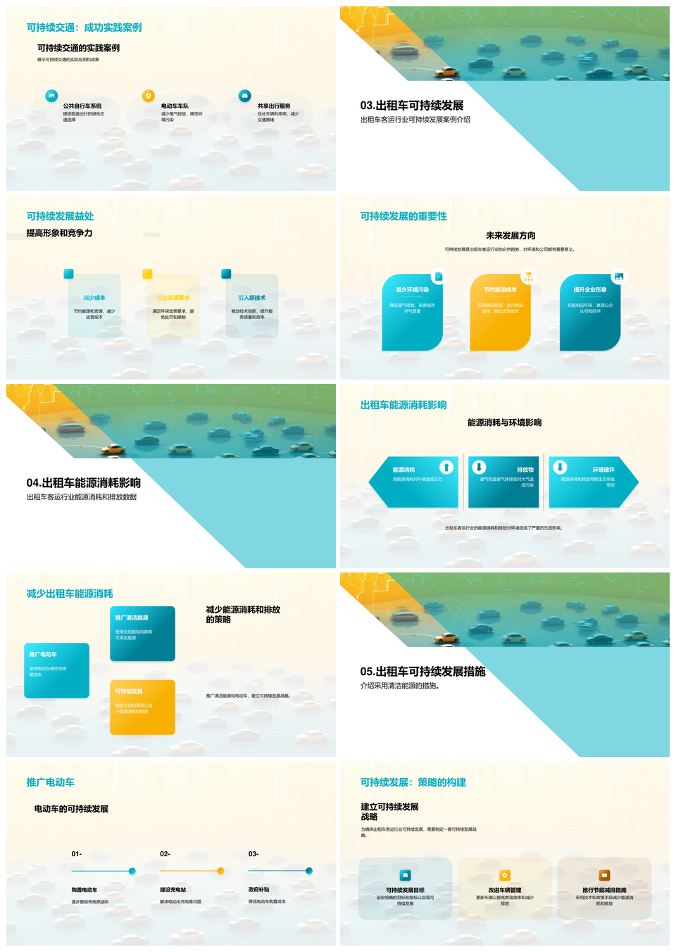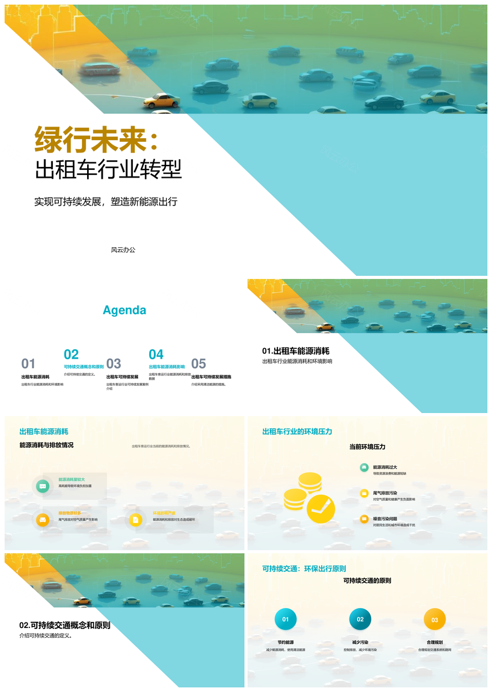 风云办公提供的出租车行业可持续交通转型减排实践PPT模板,下载格式为pptx,一共18页,作品中文字及图均可以修改和编辑,图片更改请在作品中右键图片并更换,文字修改请直接点击文字进行修改。