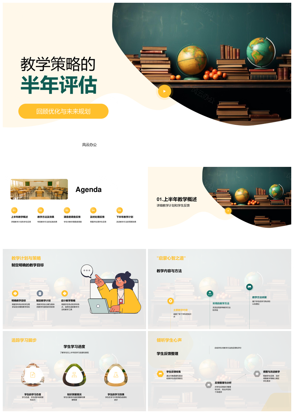 风云办公提供的教学策略半年评估优化未来规划PPT模板,下载格式为pptx,一共25页,作品中文字及图均可以修改和编辑,图片更改请在作品中右键图片并更换,文字修改请直接点击文字进行修改。