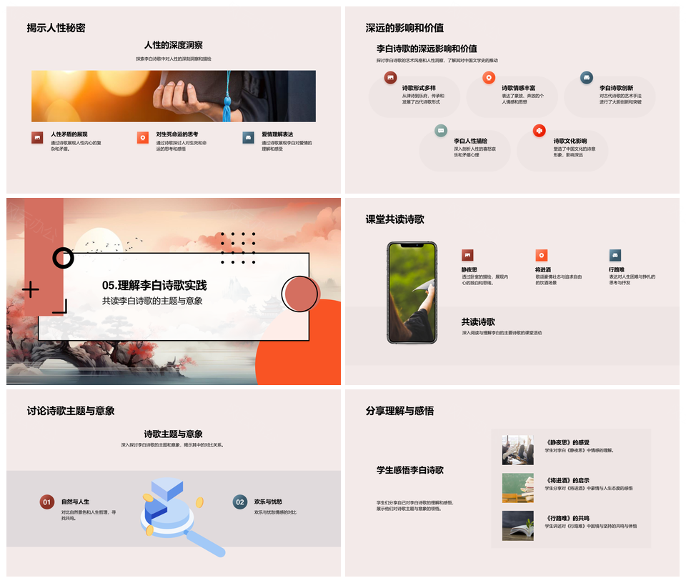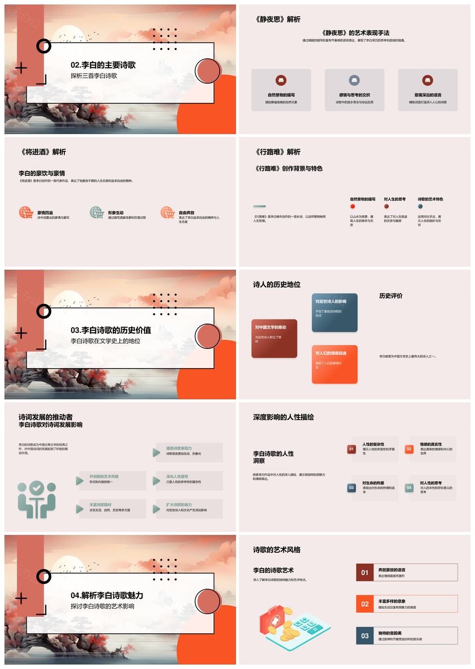 风云办公提供的李白诗人诗歌艺术经典诗作文学史卷轴PPT模板,下载格式为pptx,一共24页,作品中文字及图均可以修改和编辑,图片更改请在作品中右键图片并更换,文字修改请直接点击文字进行修改。