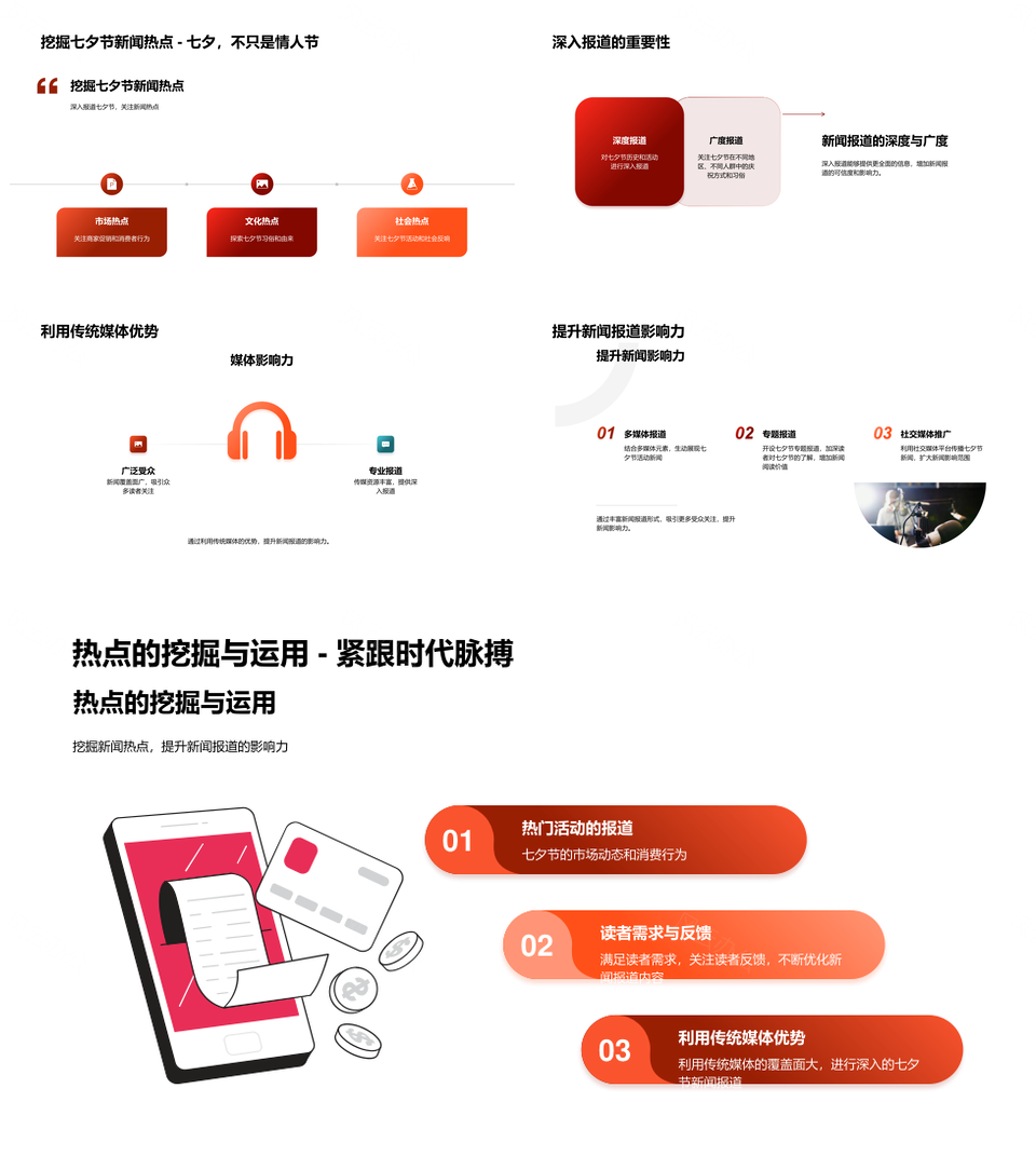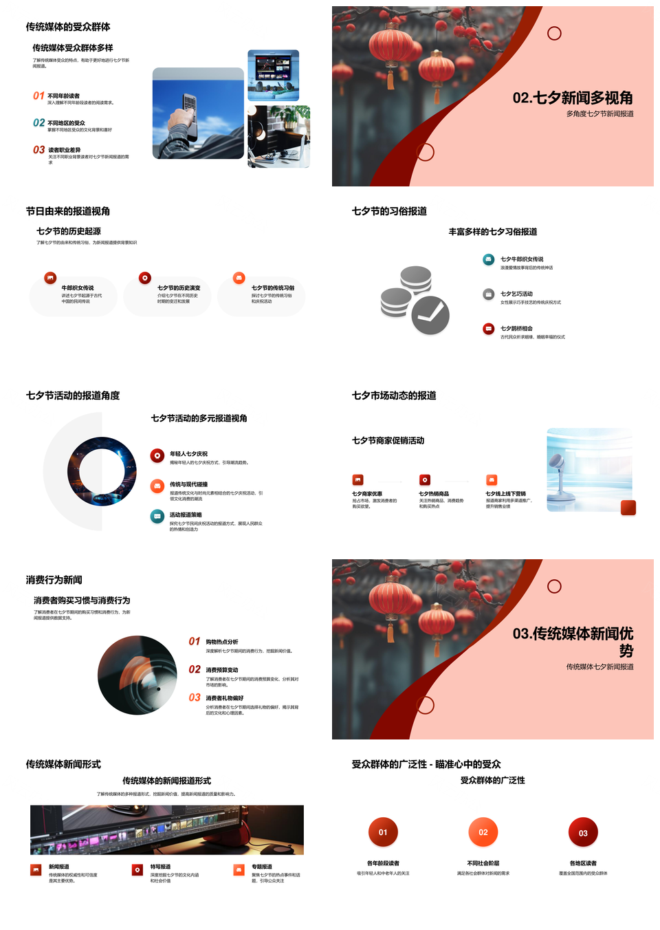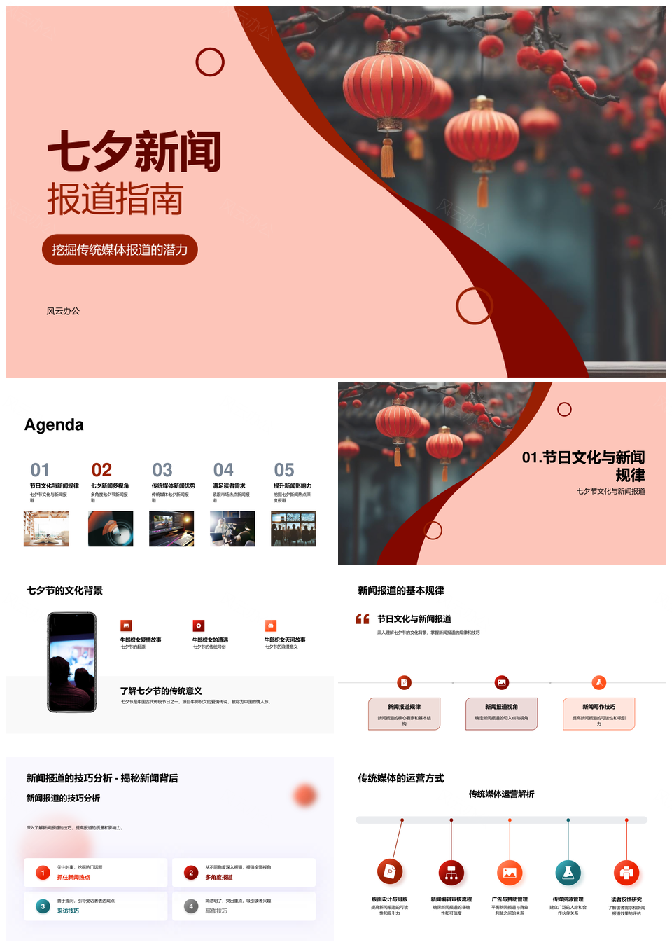 风云办公提供的传统媒体七夕文化市场消费报道指南PPT模板,下载格式为pptx,一共33页,作品中文字及图均可以修改和编辑,图片更改请在作品中右键图片并更换,文字修改请直接点击文字进行修改。