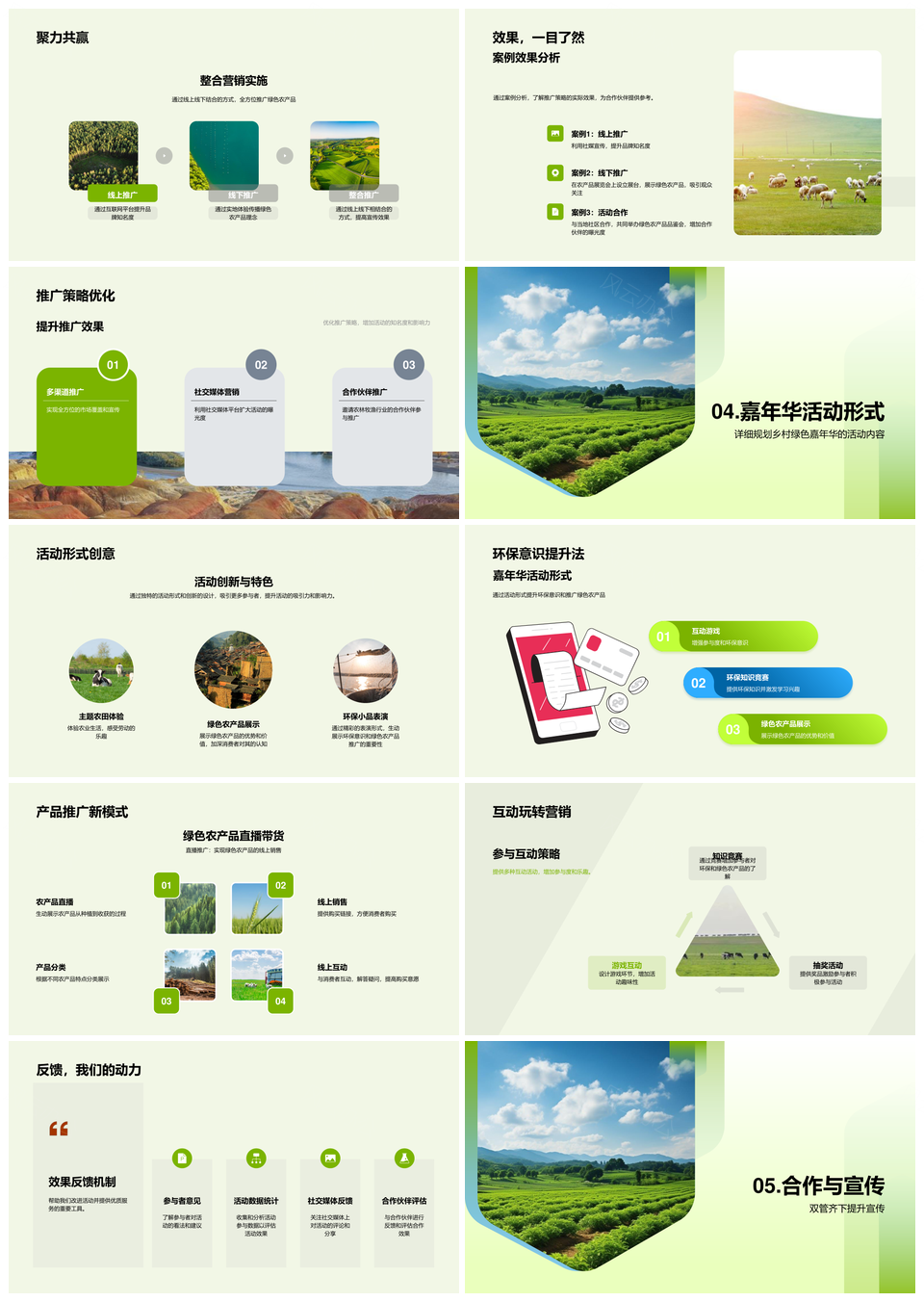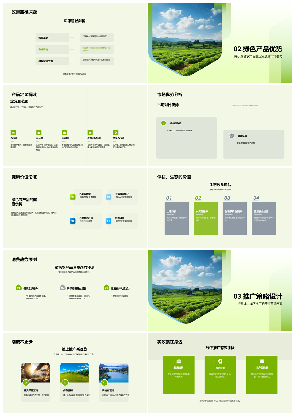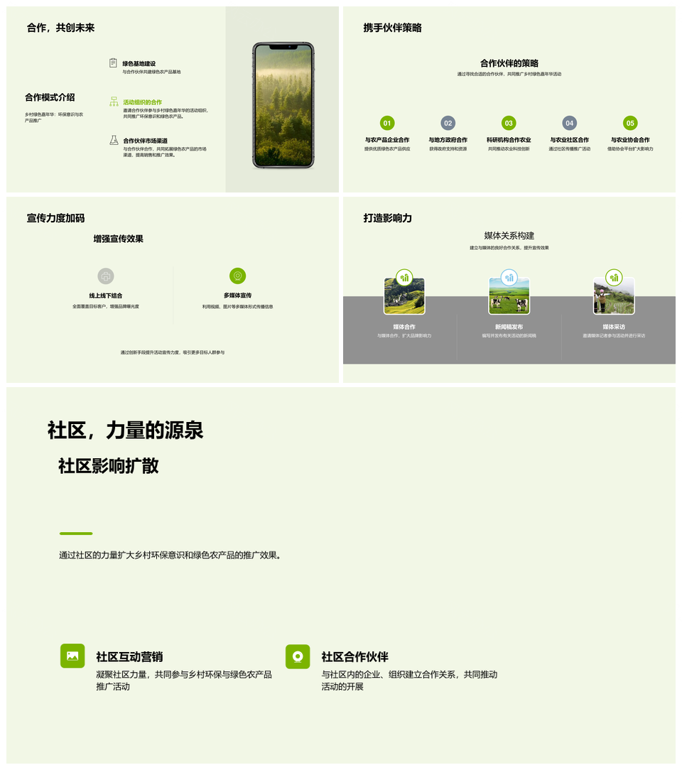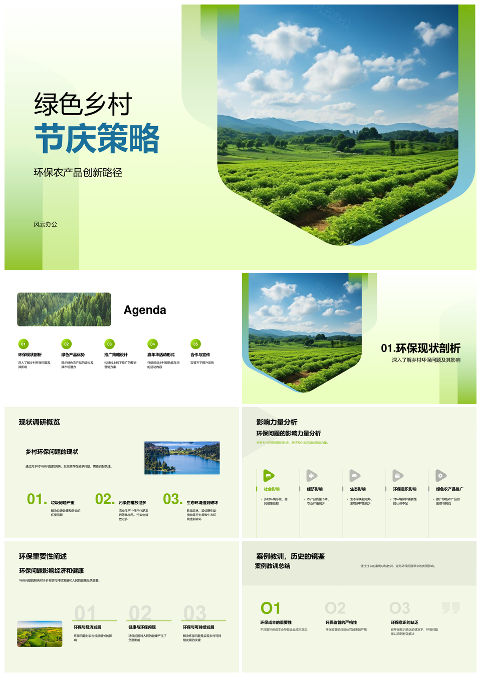 风云办公提供的绿色乡村节庆农产推广合作策略PPT模板,下载格式为pptx,一共33页,作品中文字及图均可以修改和编辑,图片更改请在作品中右键图片并更换,文字修改请直接点击文字进行修改。
