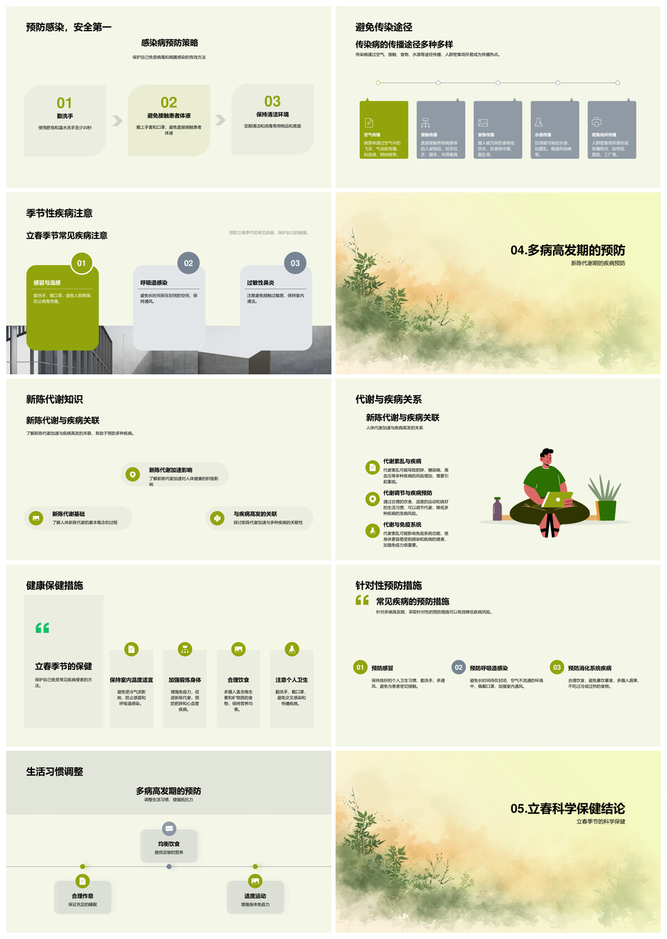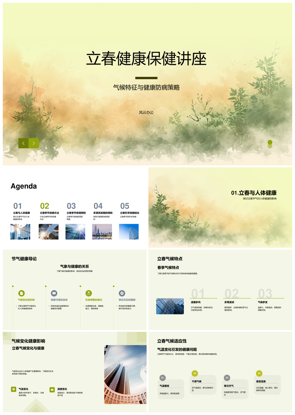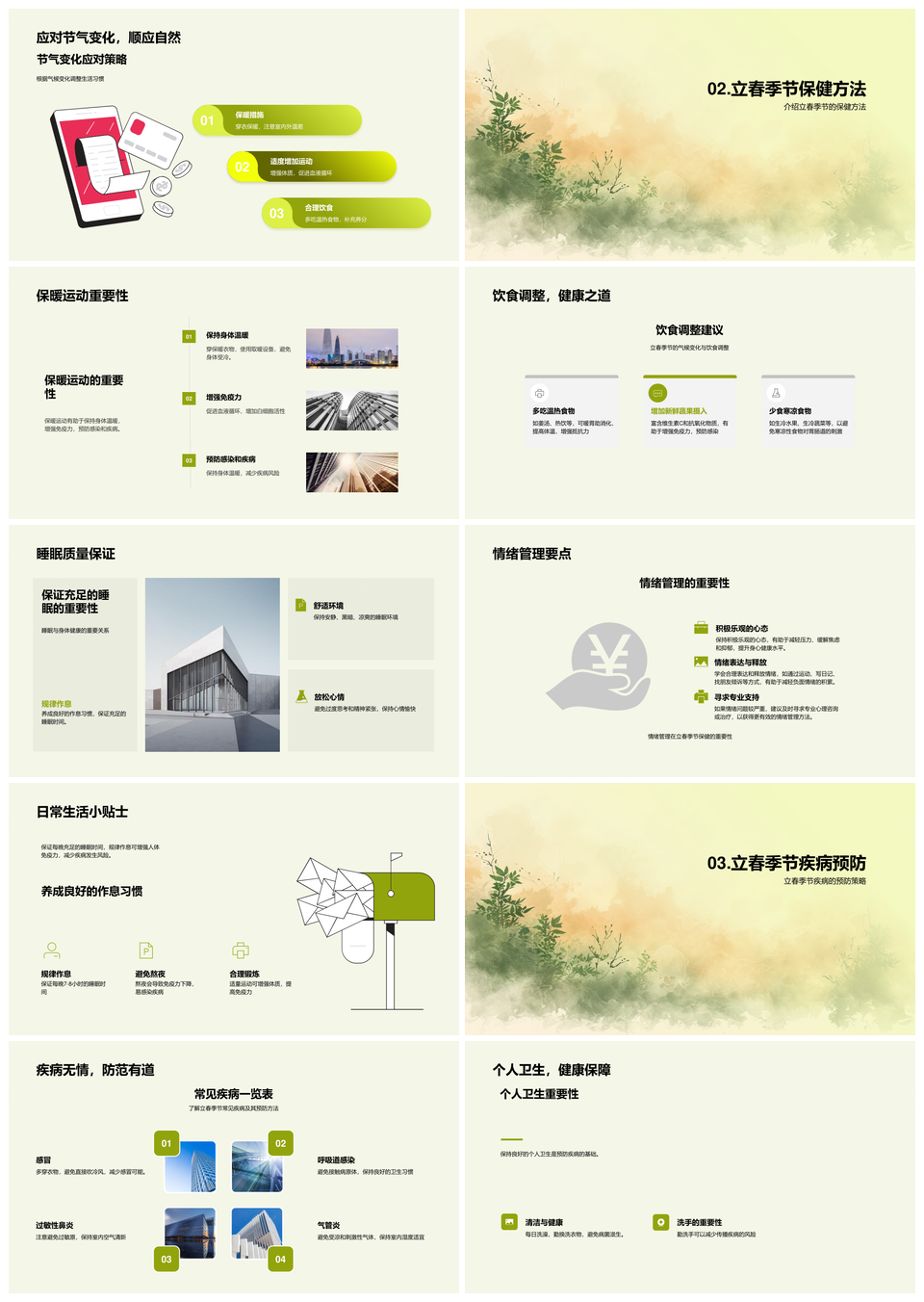 这是一张立春健康气候防病保暖饮食运动新陈代谢PPT模板,包含立春、健康、气候、防病、保暖、饮食、运动、新陈代谢等主题内容,也可用作立春健康防病保暖、健康气候防病保暖、防病保暖饮食运动、健康饮食运动新陈代谢、立春气候防病保暖、立春健康饮食运动、防病保暖运动新陈代谢、防病保暖饮食、饮食运动新陈代谢、立春健康饮食、健康防病保暖、健康气候防病、防病饮食运动、立春保暖饮食、气候防病饮食等PPT场景使用。 风云办公提供的立春健康气候防病保暖饮食运动新陈代谢PPT模板,下载格式为pptx,一共33页,作品中文字及图均可以修改和编辑,图片更改请在作品中右键图片并更换,文字修改请直接点击文字进行修改。