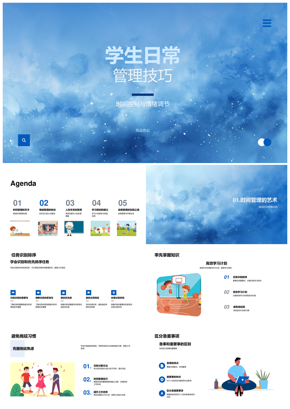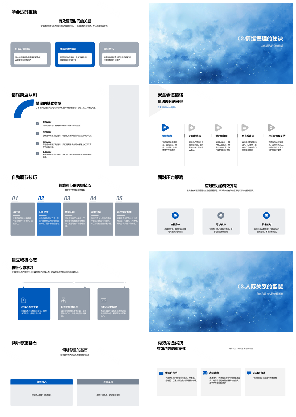 这是一张学生高效学习情绪时间管理与沟通冲突解决PPT模板,包含学生、高效学习、情绪、时间管理、沟通、冲突解决等主题内容,也可用作学生高效学习时间管理、学生高效学习沟通冲突解决、高效学习情绪时间管理、高效学习时间管理沟通、学习情绪时间管理沟通、时间管理沟通冲突解决、学生高效沟通冲突解决、学生情绪时间管理沟通、高效时间管理沟通冲突解决、情绪时间管理沟通冲突解决、学生高效学习情绪、学生高效情绪时间管理、学习时间管理沟通冲突解决、学生时间管理沟通冲突、高效学习沟通冲突解决等PPT场景使用。 风云办公提供的学生高效学习情绪时间管理与沟通冲突解决PPT模板,下载格式为pptx,一共33页,作品中文字及图均可以修改和编辑,图片更改请在作品中右键图片并更换,文字修改请直接点击文字进行修改。
