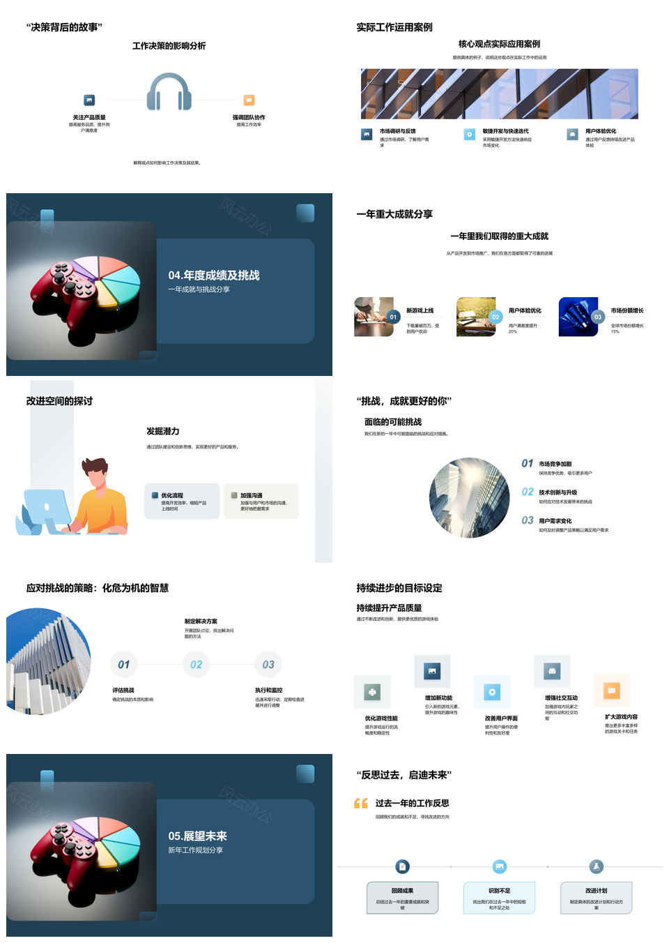 这是一张游戏开发年度回顾展望全球市场新作品质核心控制器PPT模板,包含游戏开发、年度回顾、展望、全球市场、新作品、质、核心控制器等主题内容,也可用作游戏开发年度回顾展望、年度回顾展望全球市场、展望全球市场新作、全球市场新作品质、新作品质核心、品质核心控制器、游戏开发年度回顾、年度回顾展望、展望全球市场、全球市场新作、新作品质、品质核心、核心控制器、游戏开发年度、年度回顾等PPT场景使用。 风云办公提供的游戏开发年度回顾展望全球市场新作品质核心控制器PPT模板,下载格式为pptx,一共32页,作品中文字及图均可以修改和编辑,图片更改请在作品中右键图片并更换,文字修改请直接点击文字进行修改。