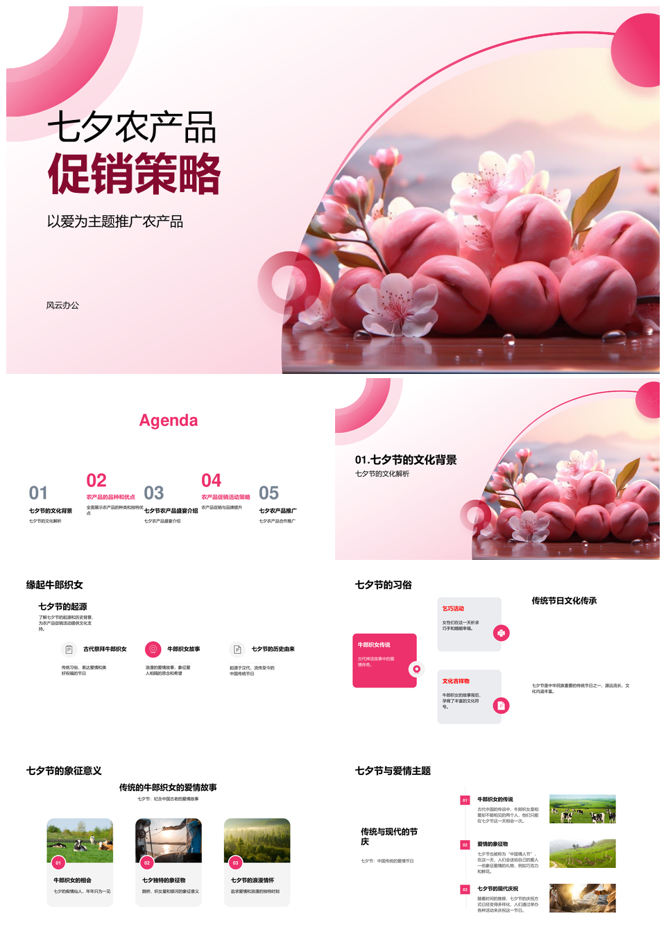 风云办公提供的七夕农产品情侣套餐促销主打新鲜果蔬PPT模板,下载格式为pptx,一共33页,作品中文字及图均可以修改和编辑,图片更改请在作品中右键图片并更换,文字修改请直接点击文字进行修改。
