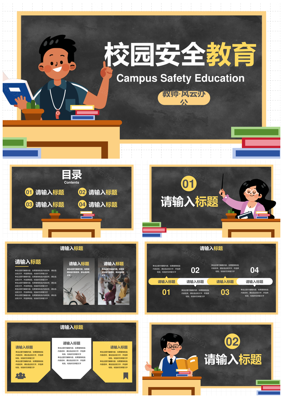 风云办公提供的校园安全教育卡通人物黑板插画PPT模板,下载格式为pptx,一共19页,作品中文字及图均可以修改和编辑,图片更改请在作品中右键图片并更换,文字修改请直接点击文字进行修改。