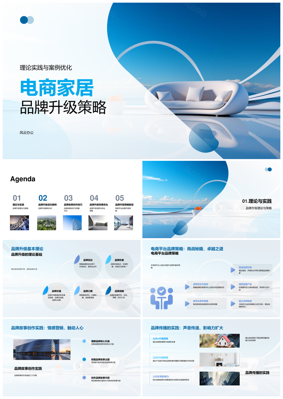 风云办公提供的电商家居品牌升级理论与营销策划实践PPT模板,下载格式为pptx,一共24页,作品中文字及图均可以修改和编辑,图片更改请在作品中右键图片并更换,文字修改请直接点击文字进行修改。