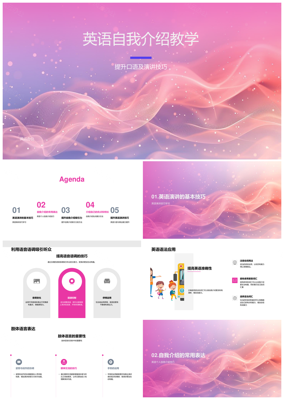 英语自我介绍演讲技巧语音语法肢体训练PPT模板推荐