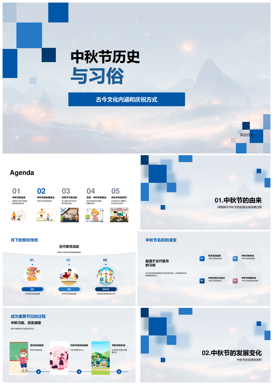 风云办公提供的中秋历史习俗祭月月饼农耕文化PPT模板,下载格式为pptx,一共23页,作品中文字及图均可以修改和编辑,图片更改请在作品中右键图片并更换,文字修改请直接点击文字进行修改。