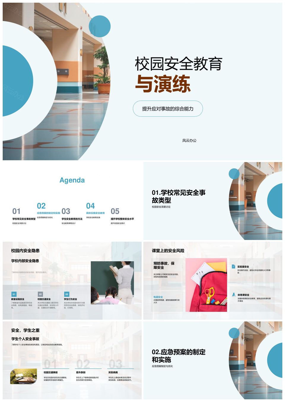 风云办公提供的学校安全教育应急演练隐患防范PPT模板,下载格式为pptx,一共24页,作品中文字及图均可以修改和编辑,图片更改请在作品中右键图片并更换,文字修改请直接点击文字进行修改。