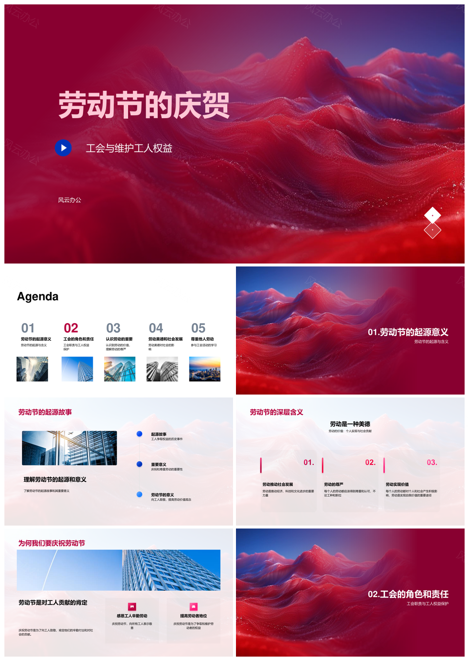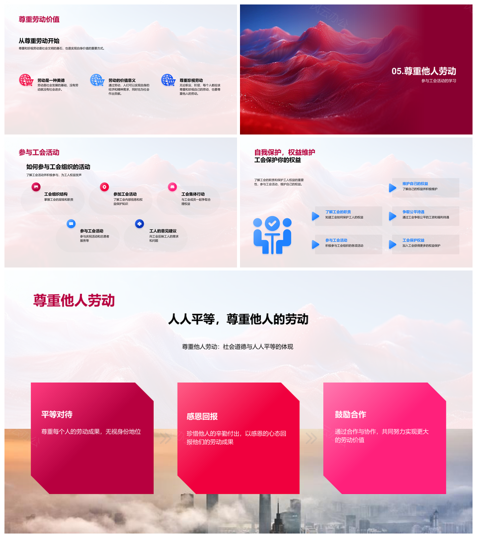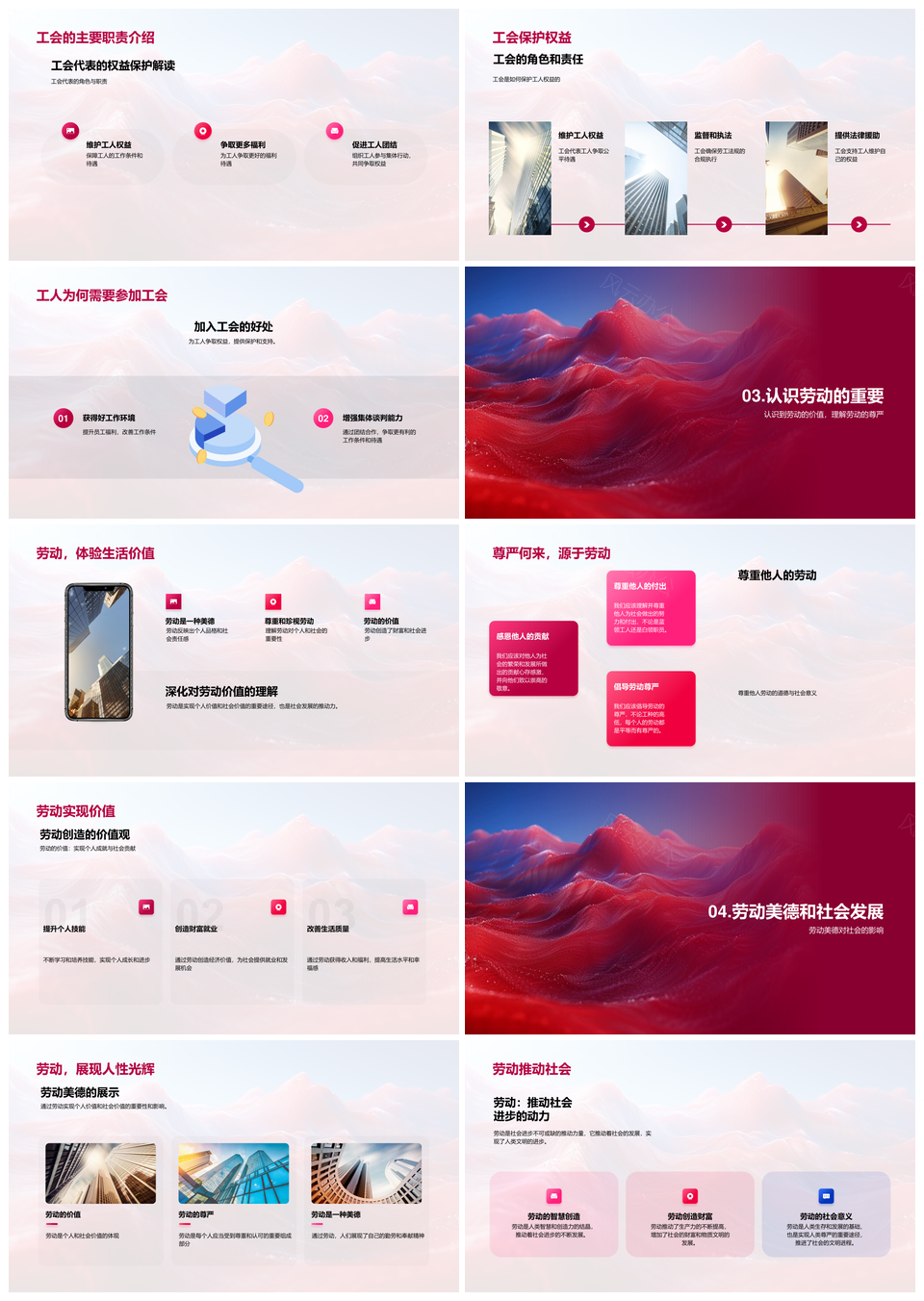 这是一张工会职责工人权益劳动价值尊严劳动节庆祝PPT模板,包含工会职责、工人权益、劳动价值、尊严、劳动节、庆祝等主题内容,也可用作工会职责工人权益、工人权益劳动价值、劳动价值尊严劳动节、工会职责工人、职责工人权益、工人权益劳动、权益劳动价值、劳动价值尊严、价值尊严劳动节、尊严劳动节庆祝、工会职责、工人权益、劳动价值、尊严劳动节、劳动节庆祝等PPT场景使用。 风云办公提供的工会职责工人权益劳动价值尊严劳动节庆祝PPT模板,下载格式为pptx,一共23页,作品中文字及图均可以修改和编辑,图片更改请在作品中右键图片并更换,文字修改请直接点击文字进行修改。