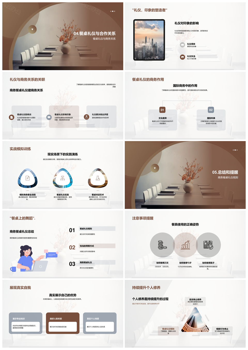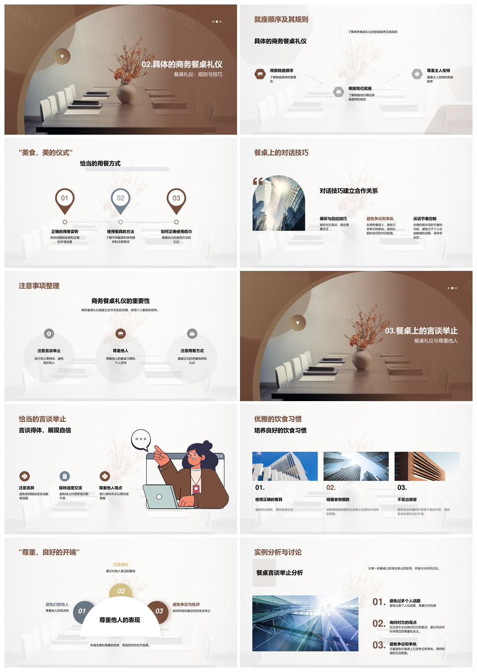这是一张商务餐桌礼仪优雅合作文化规则PPT模板,包含商务餐桌、礼仪、优雅、合作、文化、规则等主题内容,也可用作商务餐桌礼仪优雅合作、商务餐桌礼仪文化规则、餐桌礼仪优雅合作文化、商务餐桌优雅合作文化、礼仪优雅合作文化规则、商务合作文化规则、餐桌礼仪优雅合作、商务餐桌礼仪、优雅合作文化规则、合作文化规则、餐桌礼仪文化、商务合作规则、优雅合作文化、商务文化规则、礼仪文化规则等PPT场景使用。