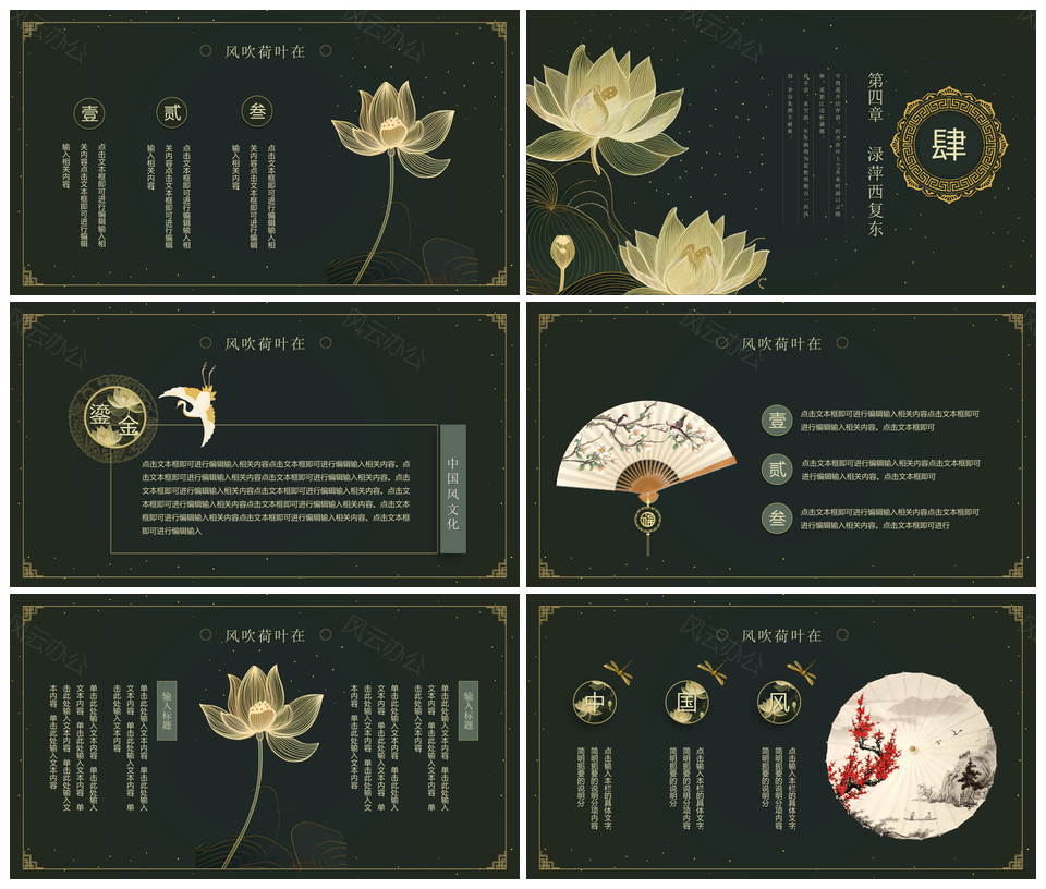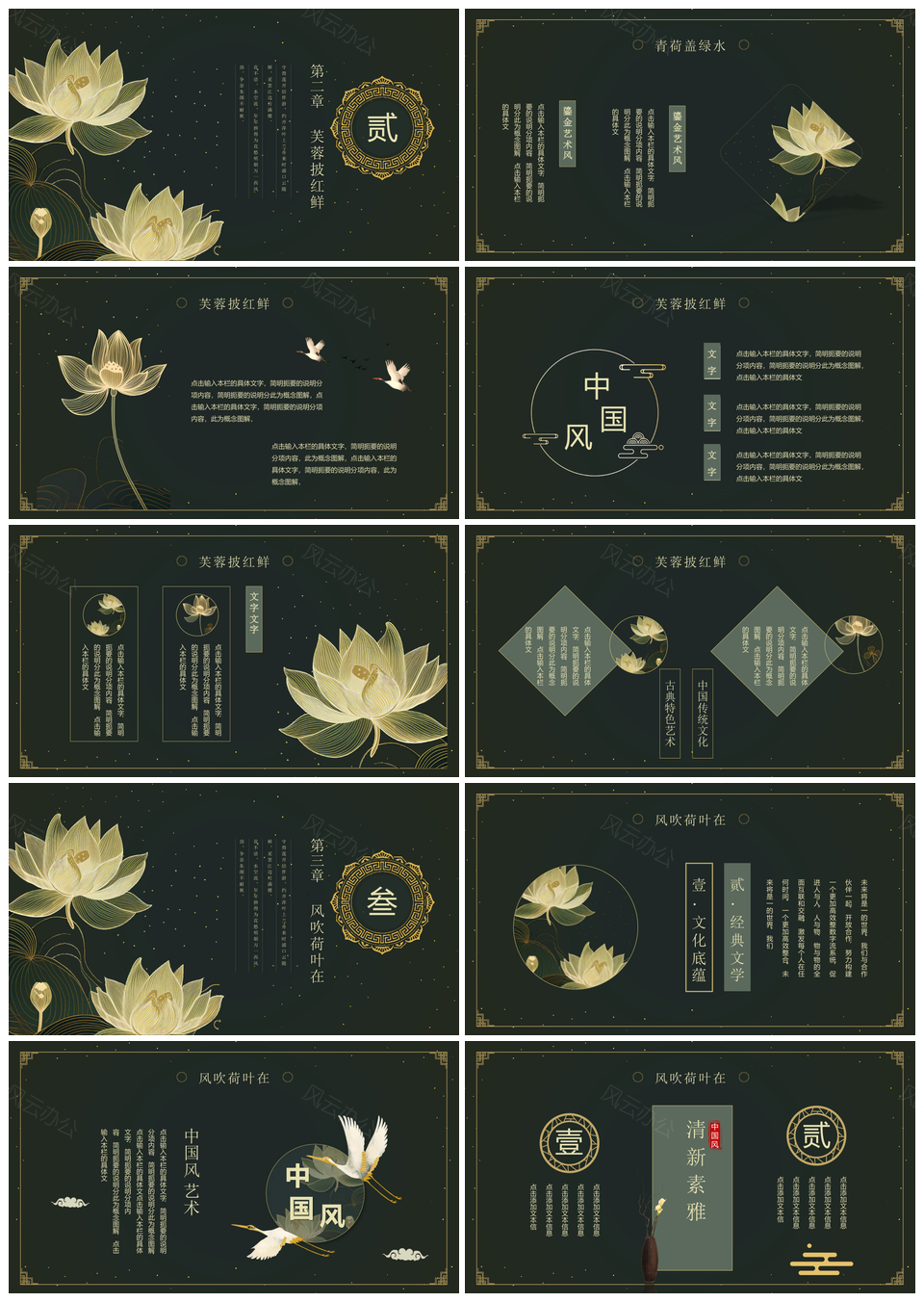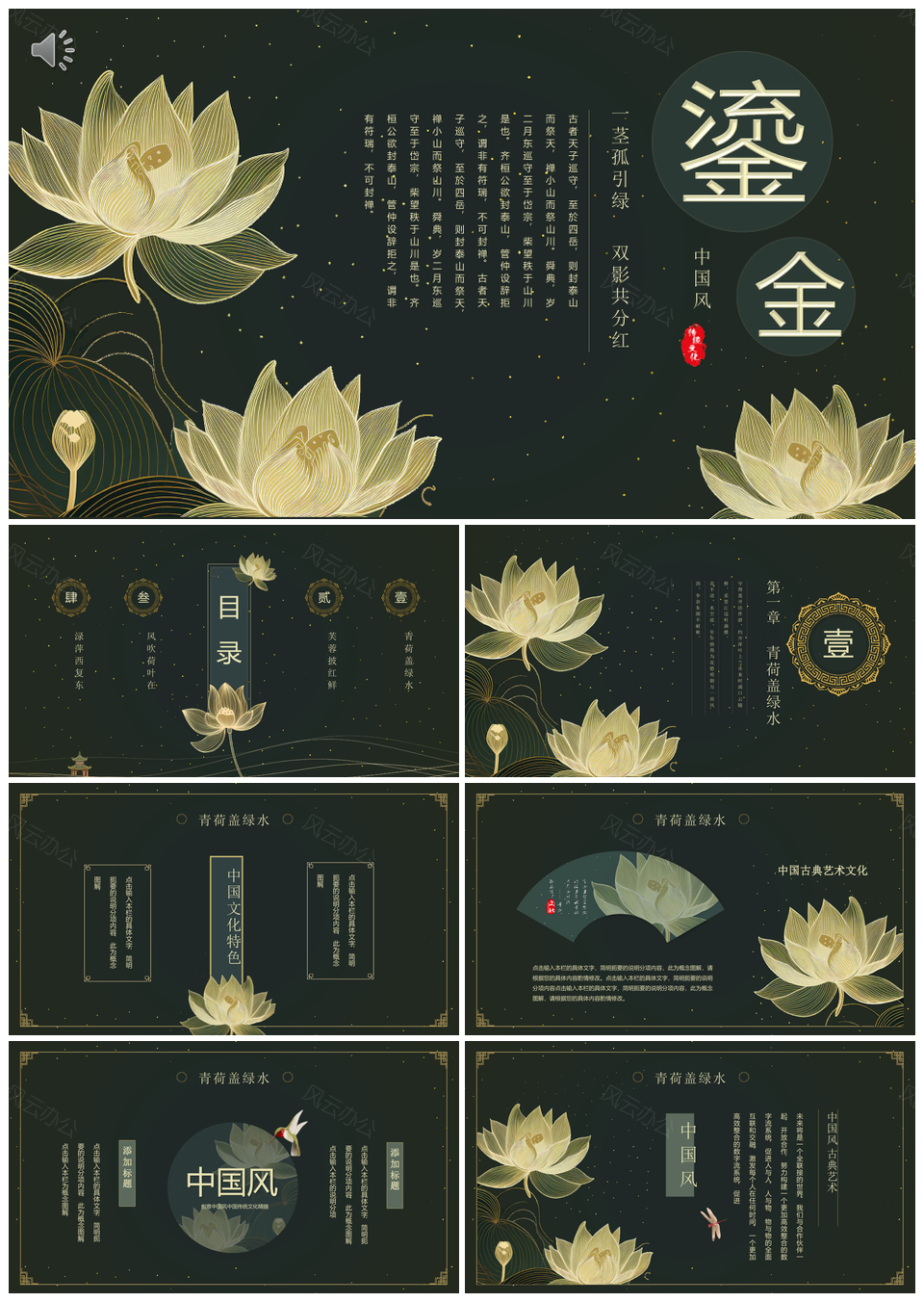 风云办公提供的鎏金中国风荷花传统文化艺术教学课件,下载格式为pptx,一共24页,作品中文字及图均可以修改和编辑,图片更改请在作品中右键图片并更换,文字修改请直接点击文字进行修改。