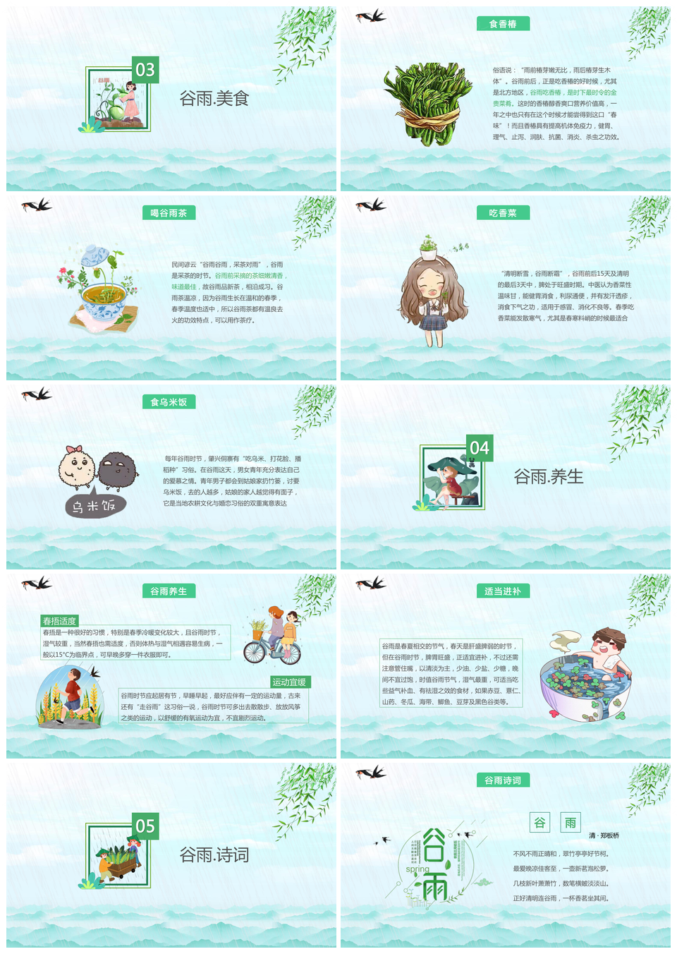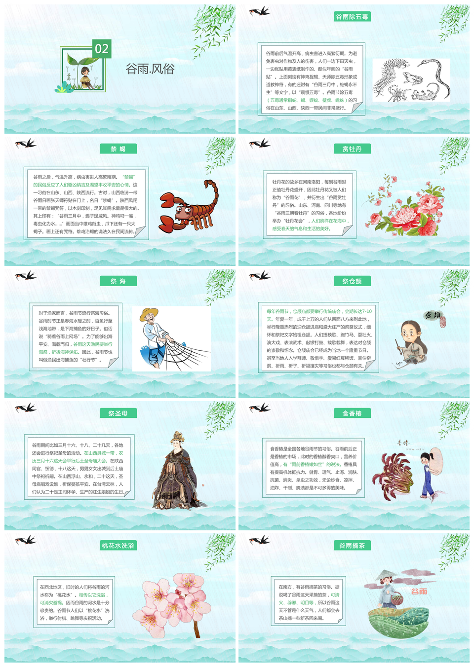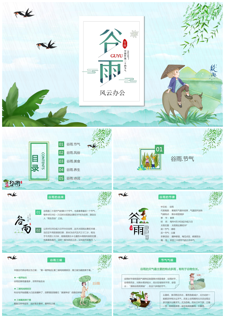 这是一张中国传统二十四节气之谷雨PPT模板,包含中国传统、二十四节气、谷雨等主题内容,也可用作中国、传统、二十四节气、谷雨 中国传统二十四节气谷雨、中国传统二十四节气、传统二十四节气谷雨、中国二十四节气谷雨、中国传统、中国二十四节气、传统二十四节气、二十四节气谷雨、谷雨二十四节气等PPT场景使用。 风云办公提供的中国传统二十四节气之谷雨PPT模板,下载格式为pptx,一共20页,作品中文字及图均可以修改和编辑,图片更改请在作品中右键图片并更换,文字修改请直接点击文字进行修改。
