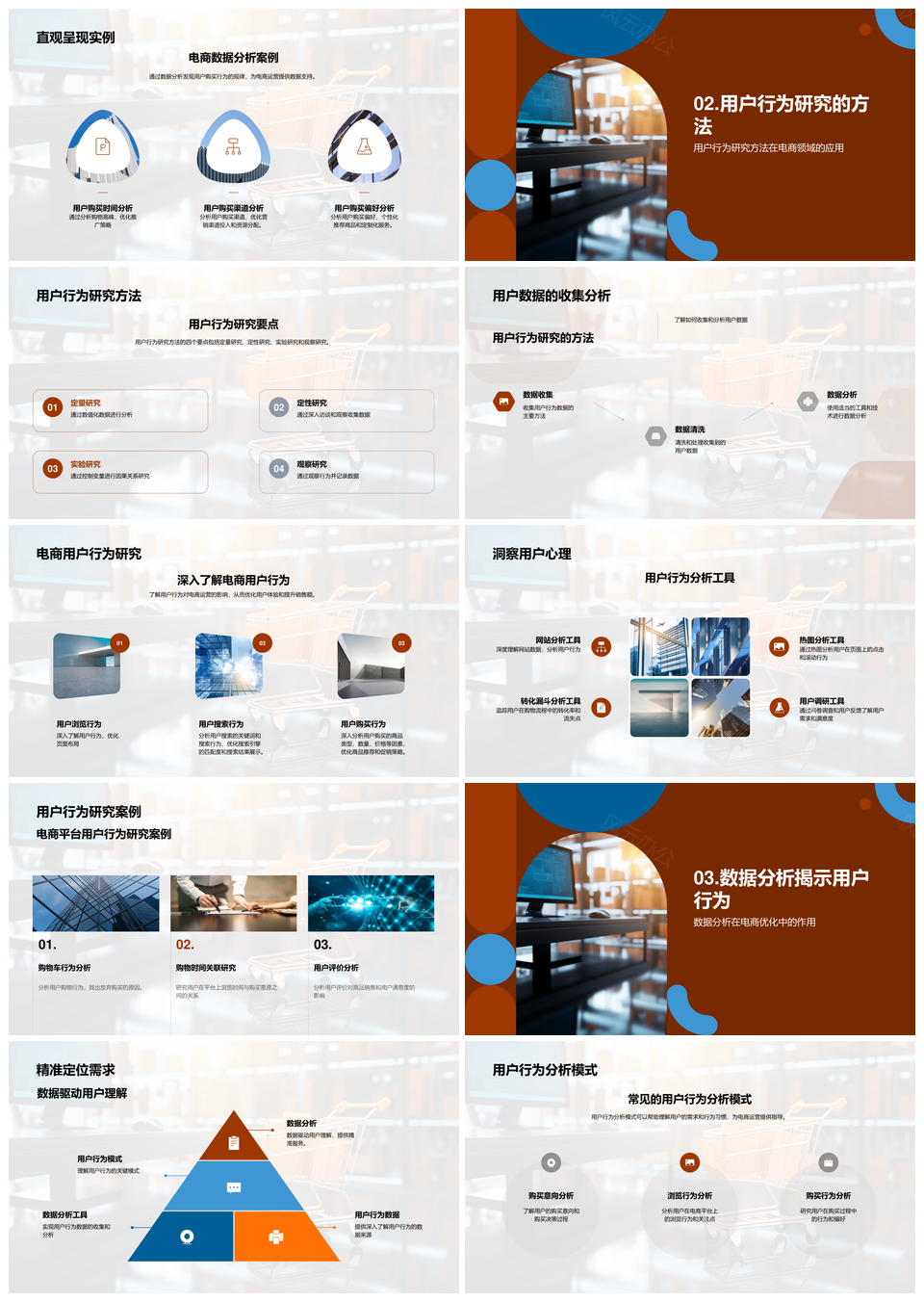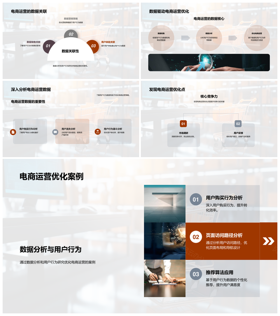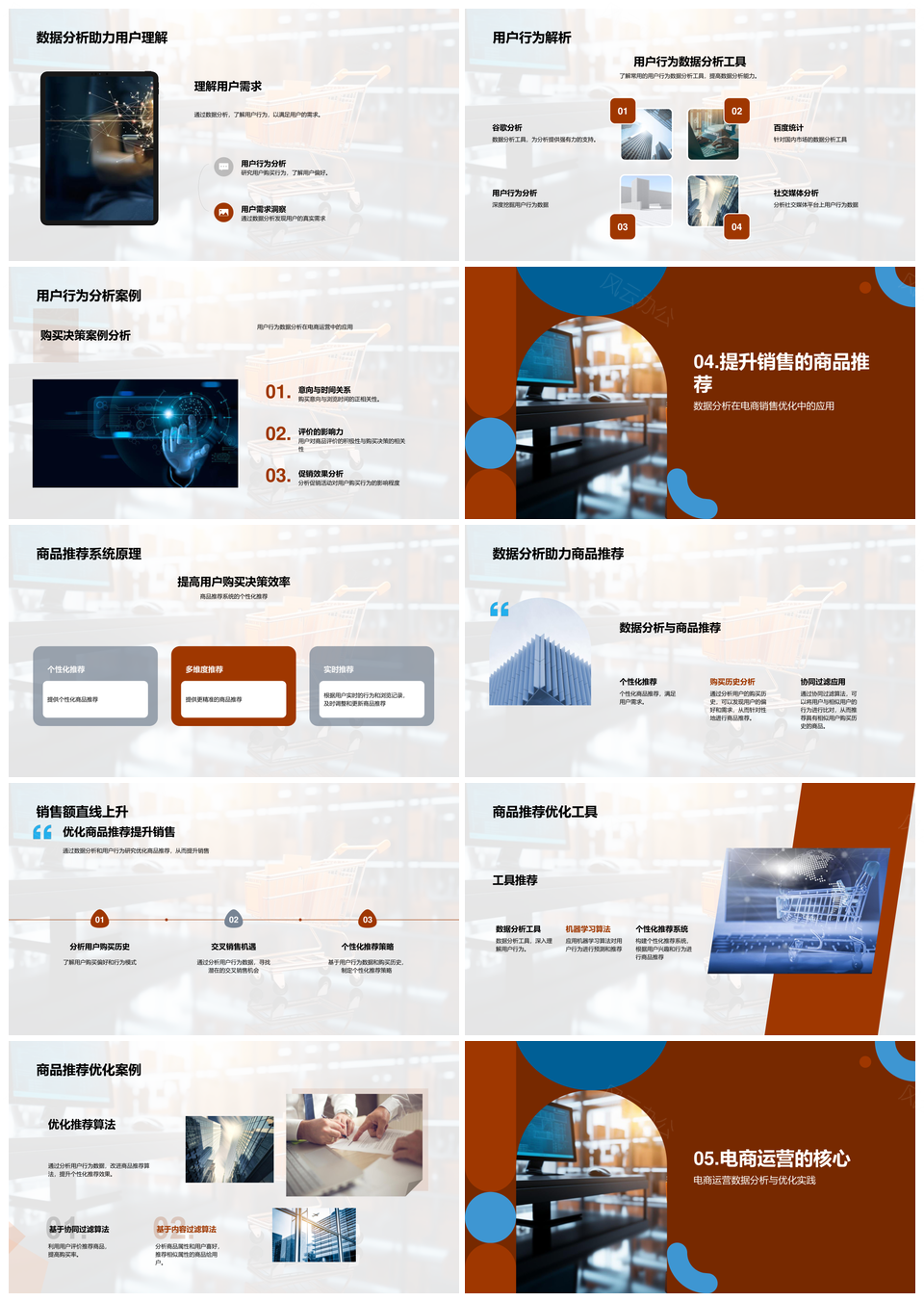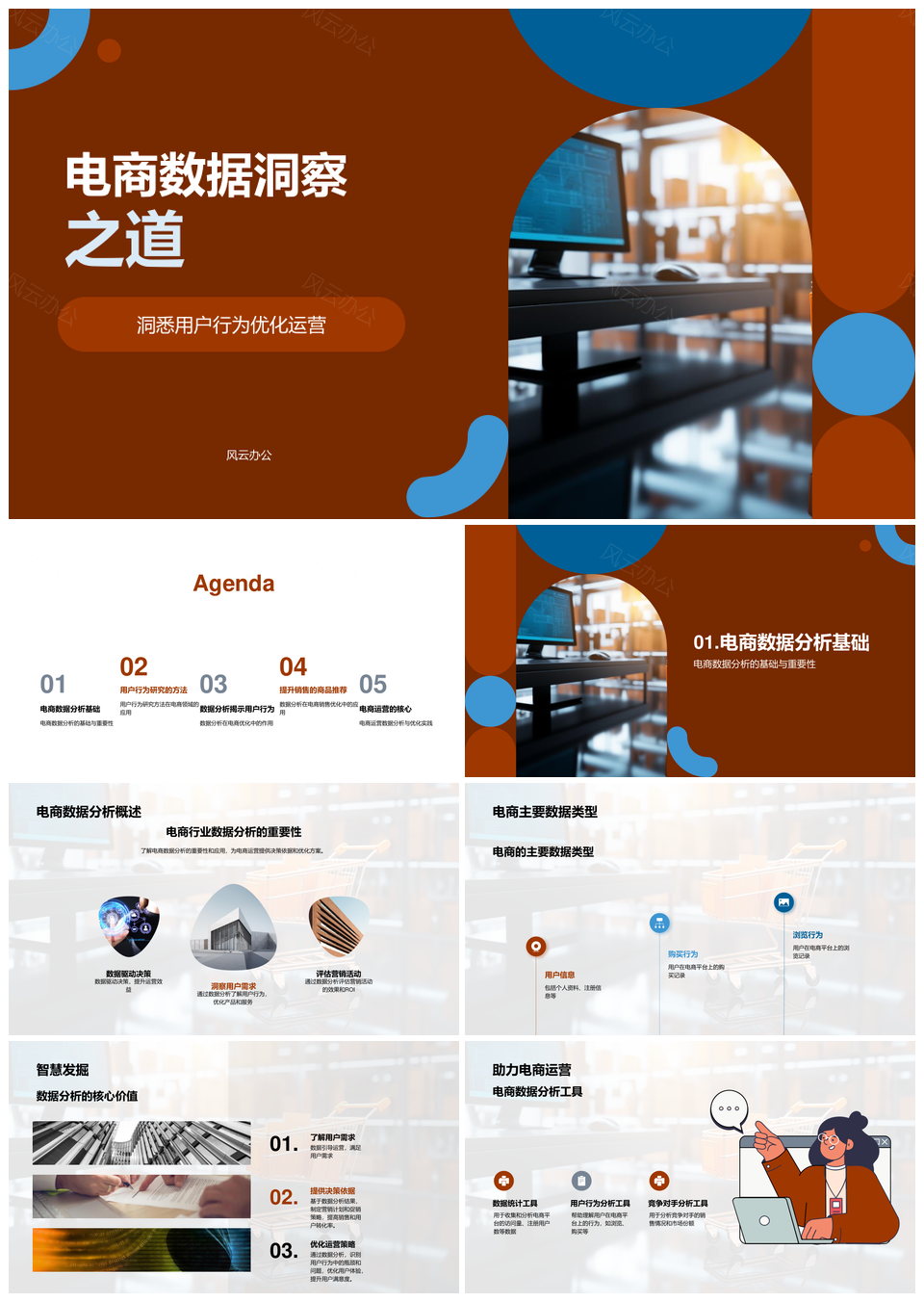 风云办公提供的电商数据分析用户行为与运营研究PPT模板,下载格式为pptx,一共33页,作品中文字及图均可以修改和编辑,图片更改请在作品中右键图片并更换,文字修改请直接点击文字进行修改。