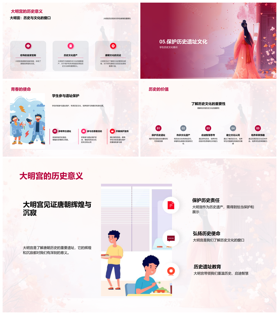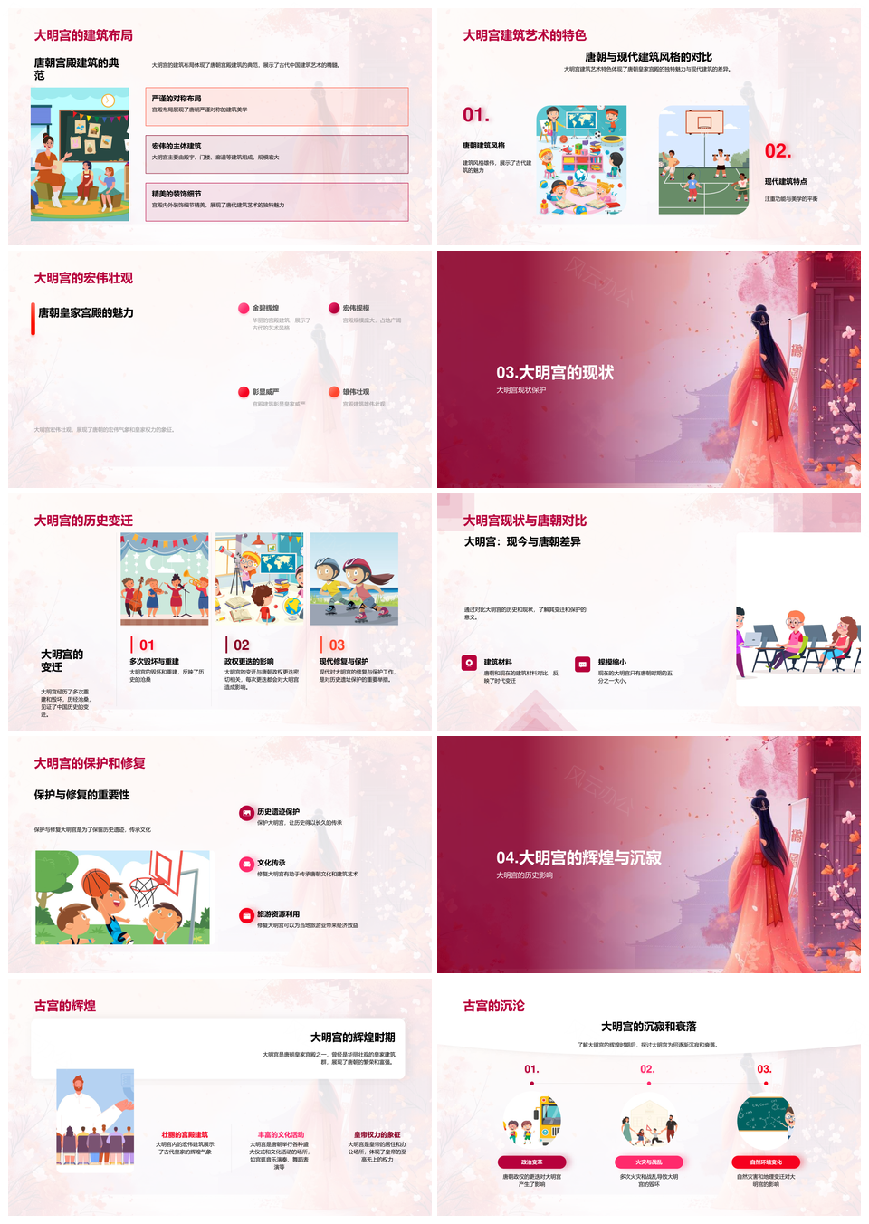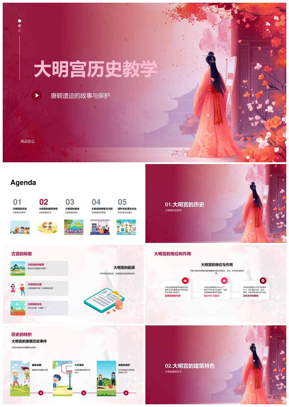风云办公提供的唐朝大明宫建筑保护修复历史教学PPT模板,下载格式为pptx,一共23页,作品中文字及图均可以修改和编辑,图片更改请在作品中右键图片并更换,文字修改请直接点击文字进行修改。