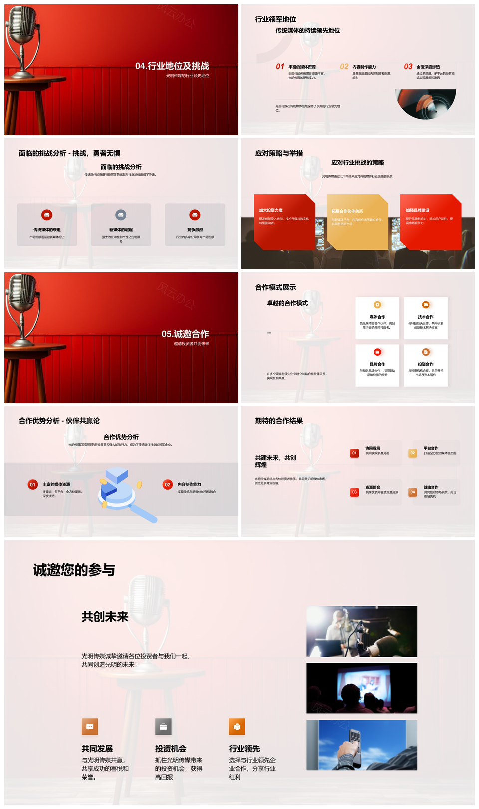 这是一张光明传媒新媒体多渠道运营与内容制作创新挑战PPT模板,包含光明传媒、新媒体、多渠道、运营、内容制作、创新、挑战等主题内容,也可用作光明传媒新媒体多渠道运营、新媒体多渠道运营内容制作、多渠道运营内容制作创新挑战、光明传媒新媒体运营、光明传媒多渠道运营、光明传媒运营内容制作、新媒体多渠道运营、新媒体运营内容制作、多渠道运营内容制作、运营内容制作创新挑战、光明传媒运营、光明传媒内容制作、新媒体运营、新媒体内容制作、内容制作创新挑战等PPT场景使用。 风云办公提供的光明传媒新媒体多渠道运营与内容制作创新挑战PPT模板,下载格式为pptx,一共27页,作品中文字及图均可以修改和编辑,图片更改请在作品中右键图片并更换,文字修改请直接点击文字进行修改。