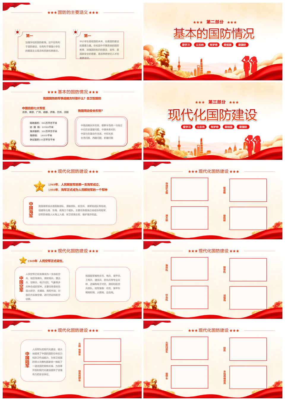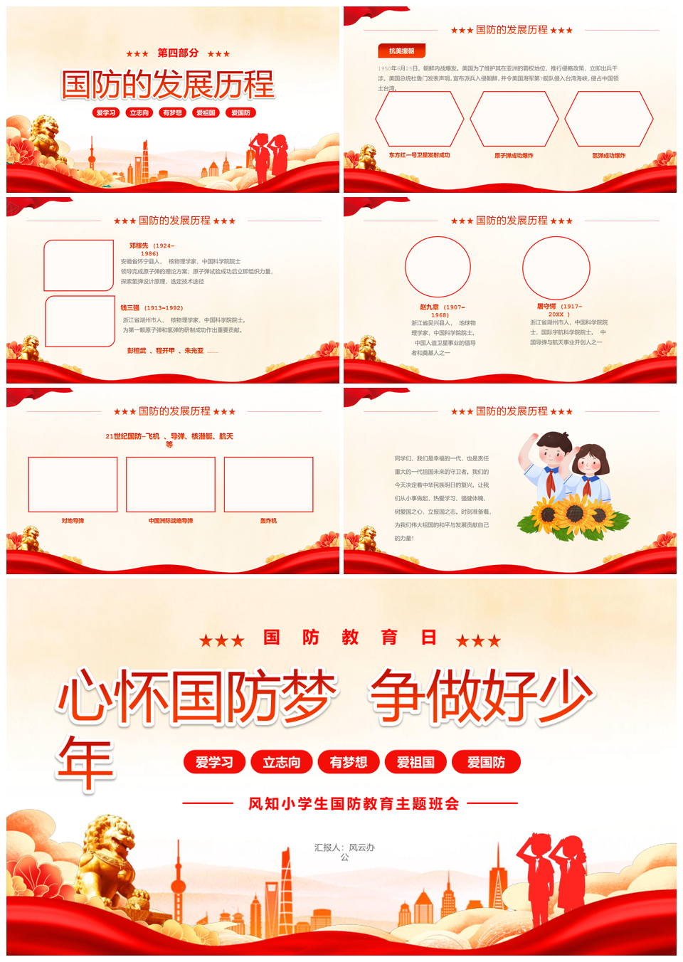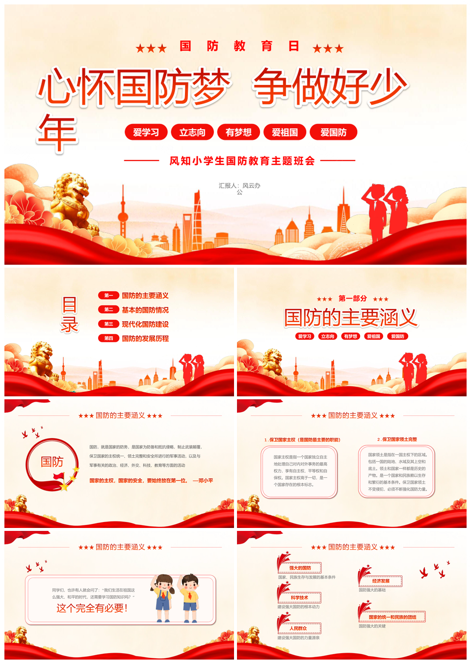 风云办公提供的红色动画卡通小学国防教育主题班会PPT模板,下载格式为pptx,一共25页,作品中文字及图均可以修改和编辑,图片更改请在作品中右键图片并更换,文字修改请直接点击文字进行修改。
