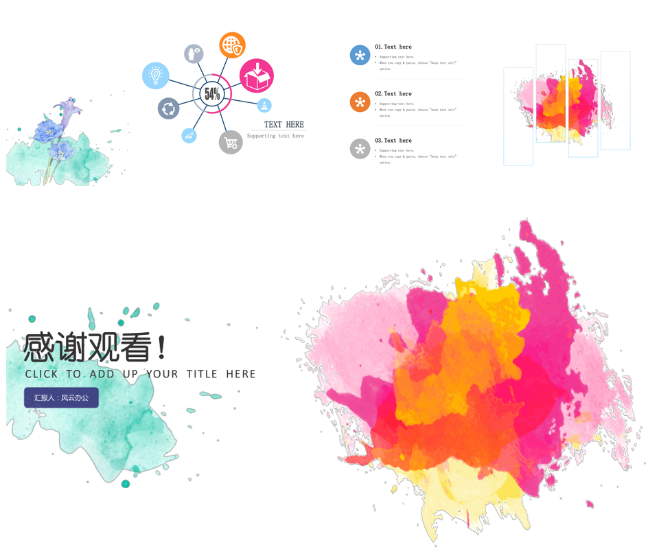 这是一张水彩风商务通用ppt模板通用PPT模板,包含水彩风、商务等主题内容,也可用作水彩风、商务、通用、模板 水彩风商务通用模板、水彩风商务通用、水彩风商务模板、水彩风通用模板、商务通用模板、水彩风模板、商务通用、商务模板、通用模板等PPT场景使用。 风云办公提供的水彩风商务通用ppt模板通用PPT模板,下载格式为pptx,一共20页,作品中文字及图均可以修改和编辑,图片更改请在作品中右键图片并更换,文字修改请直接点击文字进行修改。